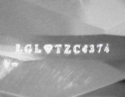 This gemstone has been laser inscribed for security purposes using the latest micro laser technology. The image above is the actual inscription on this gemstone photographed with a specialized micro camera at 45 x. the inscription corresponds with the certificate report number on the accompanying lgl certificate.
