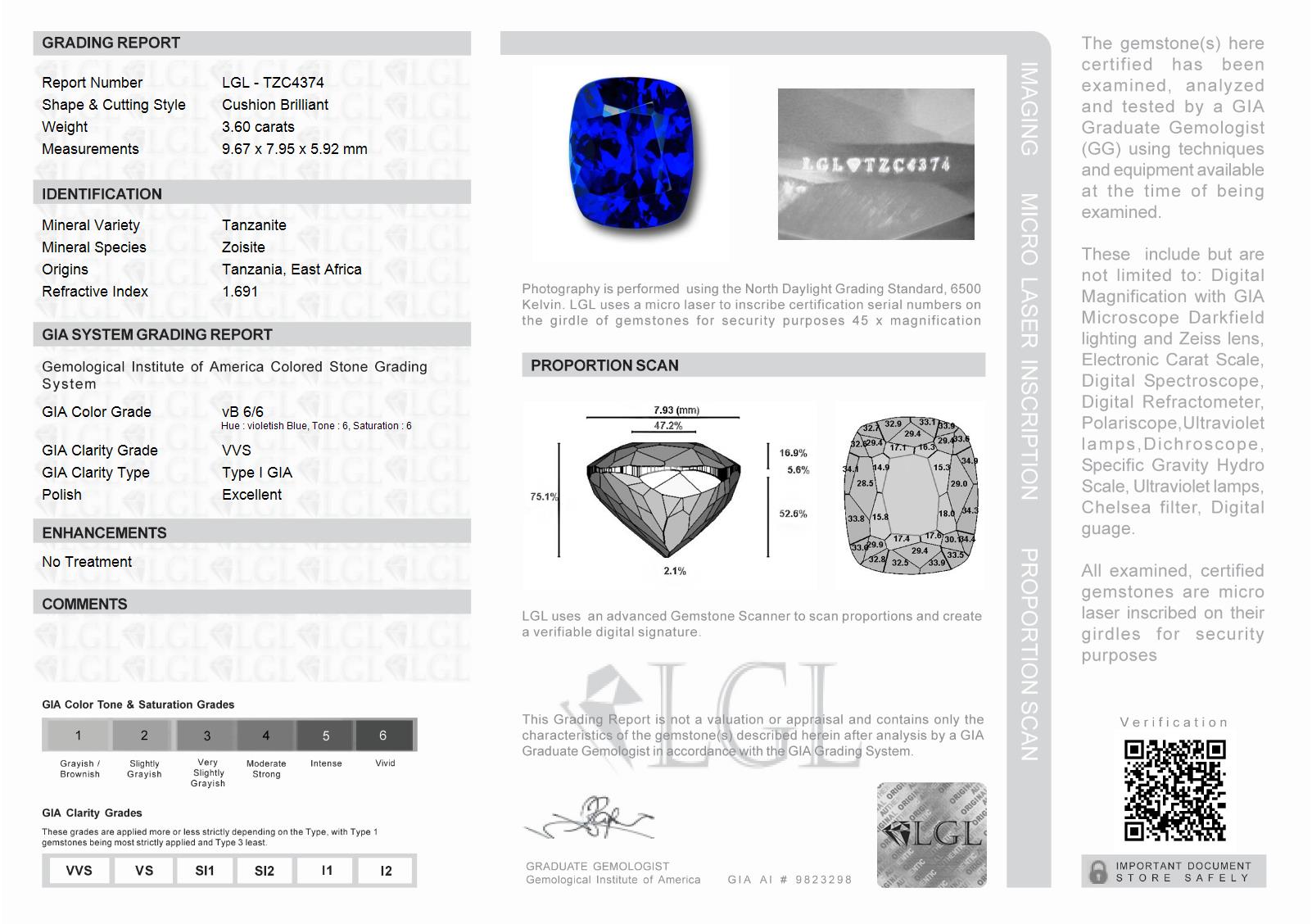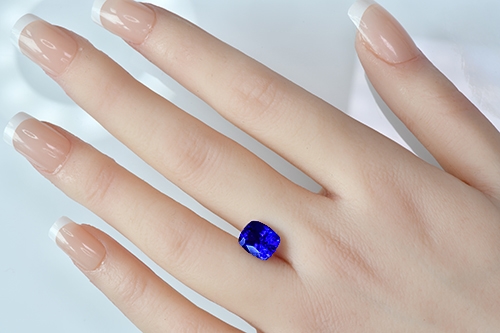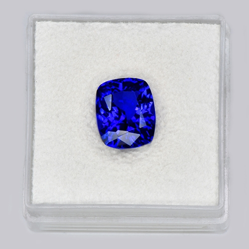 This exceptional Cushion Brilliant Tanzanite, weighing in at 3.60 carats, stands out as a perfect investment-grade gem. It radiates with an extraordinary depth of color saturation. Its fascinating hue exudes a velvety, intense royal blue that commands attention and exudes a stunning sense of luxury. What makes it truly outstanding is its excellent red flash effect under incandescent light; it beautifully showcases a palette of intense crimsons and pinks, adding to its unparalleled appeal. Overall, this impressive Tanzanite guarantees to be a dazzling centerpiece to any jewelry collection or investment portfolio, combining exceptional quality with incredible aesthetic appeal.