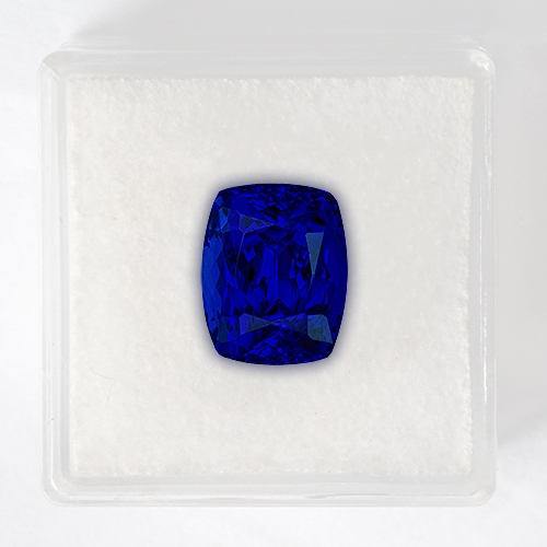 If you are looking for a Tanzanite that rivals the finest Sapphire, then look no further. This stunning 6.32 carat cushion is a dream stone. You just don't see Tanzanites like this any more. The color is a deep, vivid almost velvet Blue that even a Kashmir Sapphire would envy. Light explodes from within its depths driven by a myriad of facets on its pavilion. Wonderful cutting and flawless clarity add to its unrivaled pedigree. The pinnacle of Tanzanite pedigree.