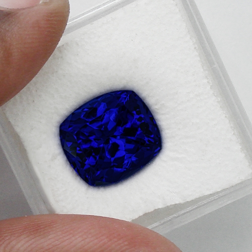If you are looking for a Tanzanite that rivals the finest Sapphire, then look no further. This stunning 6.42 carat cushion is a dream stone. You just don't see Tanzanites like this any more. The color is a deep, vivid almost velvet Blue that even a Kashmir Sapphire would envy. Light explodes from within its depths driven by a myriad of facets on its pavilion. Wonderful cutting and flawless clarity add to its unrivaled pedigree. The pinnacle of Tanzanite pedigree.