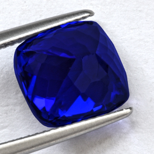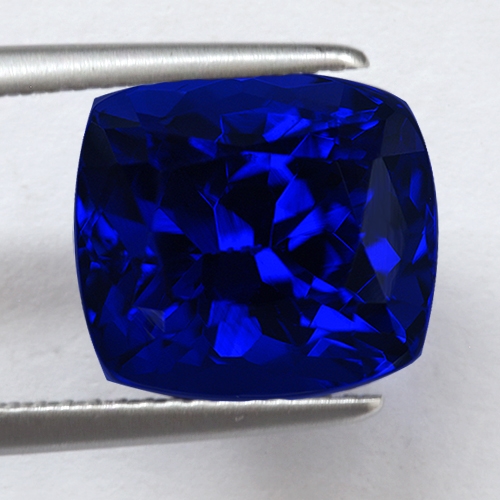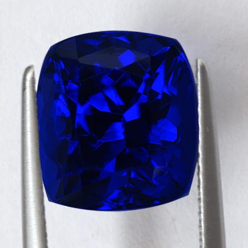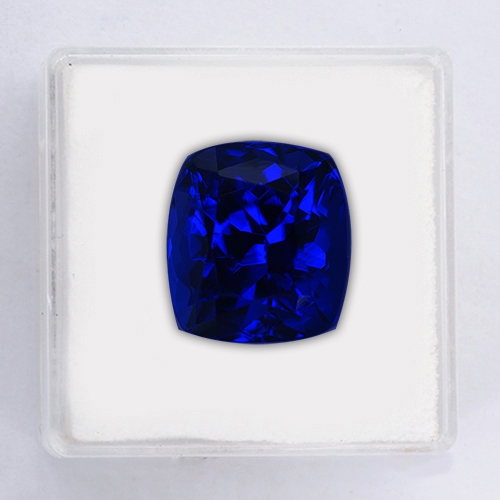 Kashmir cornflower blue of the highest intensity. This beautiful investment grade piece closely resembles a Kashmir sapphire due to its dreamy, velvety blue hue. The resemblance ends though when seen under incandescent light as a riot of red flashes explodes within the stone. This wonderful 7.52 carat cushion is extremely rare; its color harks back to the early days of Tanzanite mining and is very rarely mined these days. Flawless and top cutting. A superb investment grade piece in all respects.