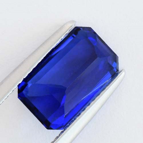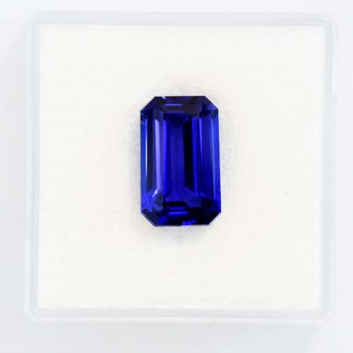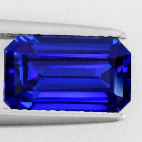 A fine and rare Tanzanite. This wonderful 3.78 Emerald Cut boasts all the characteristics of the finest genre. A remarkable depth and vividness of color cut predominately on the blue axis leading to a very fine sharp crisp blue in white light and flecked with periwinkle and violet in incandescent light. Emerald cuts can tend to "leak" color due to the nature of the long straight facets on the pavilion but this stone holds it strongly, exhibiting exceptional saturation.. A fine, rare Tanzanite indeed.