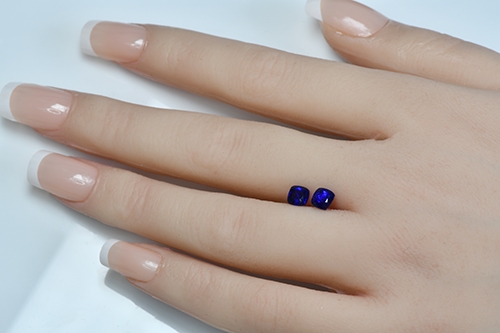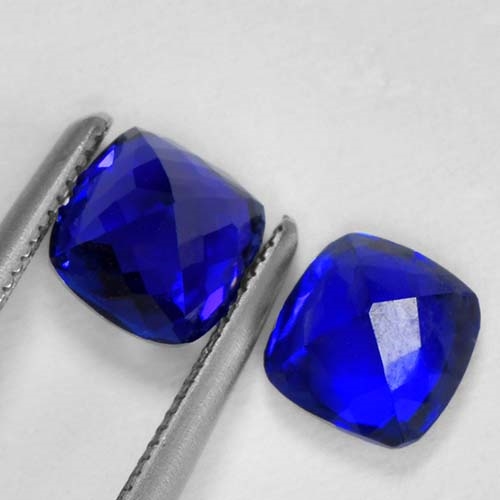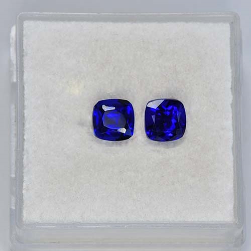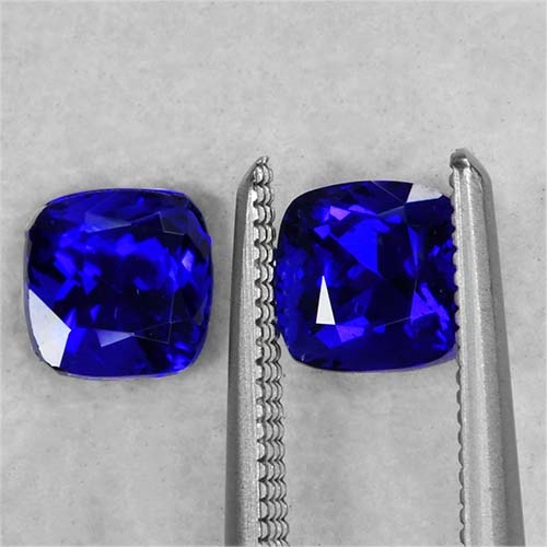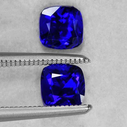 Tanzanites in the 1 carat and below range with true vB 6/6 color saturations are an extreme rarity. Matched pairs in this size range are exceptionally rarer. Anyone who has searched in vain for a matched pair in this size with the deepest, most vivid blue is invariably disappointed and ends up settling for a paler, more lavender version of what they had hoped for. However, occasionally, this quality is mined in this size and small crystals of extremely deep color are found. Being based at the mouth of the mine allows us to snap these up on the rare occasion they are found. This superb pair of cushions is one such pair. Cut from crystals of the very deepest color, flawless and very well cut. A truly rae and very beautiful pair of Tanzanites.