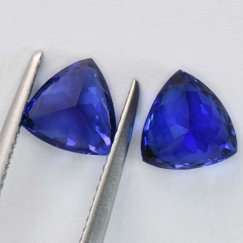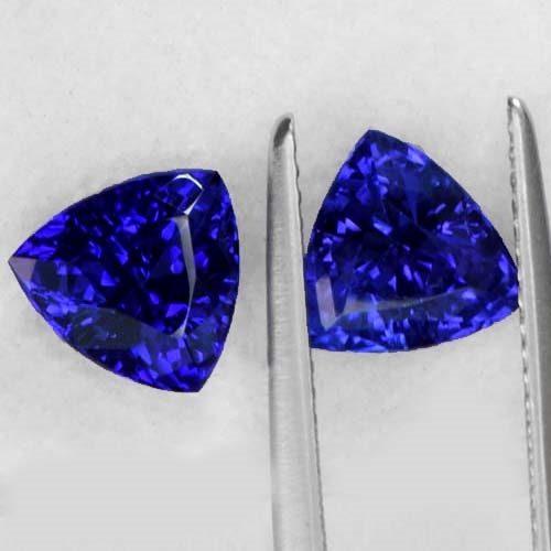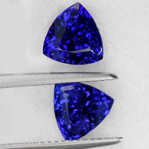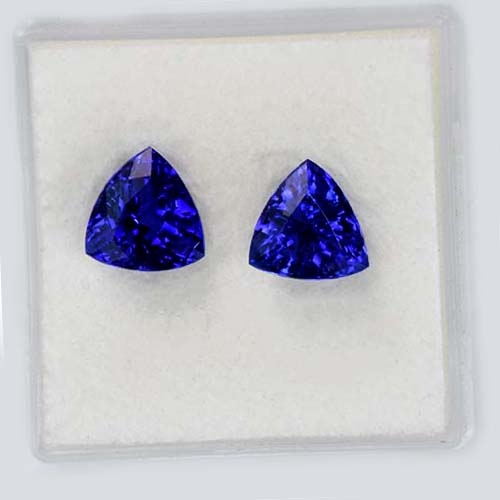 Tanzanites in small sizes are so rare in top colors that some people don't believe they exist at all. They do, but they are rarely mined. Being based at the mouth of the mine allows us to snap these up on the rare occasion they are found. This superb pair of trillions is one such pair. Cut from crystals of the very deepest color, flawless and very well cut. A truly rare and very beautiful pair of Tanzanites.
