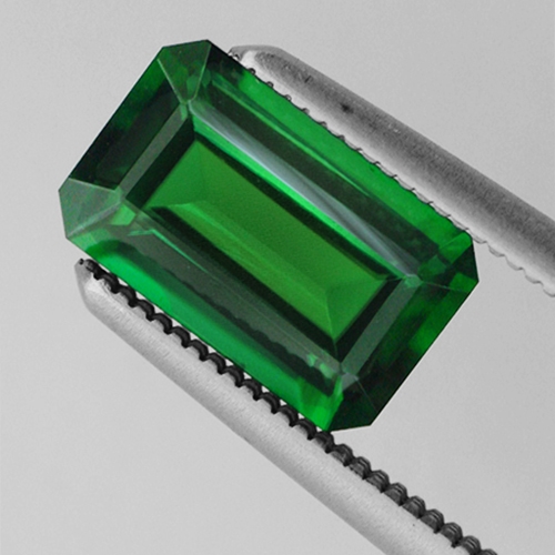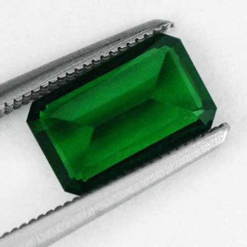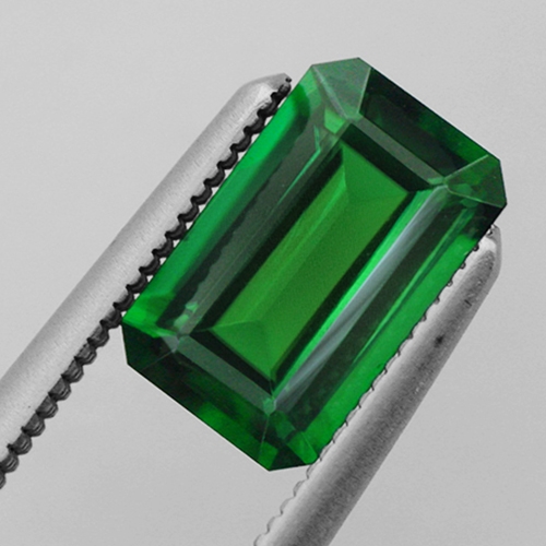 This lovely long emerald cut Chrome Tourmaline from Kenya boasts exquisite color a strong intense green and flawless clarity. Superb.