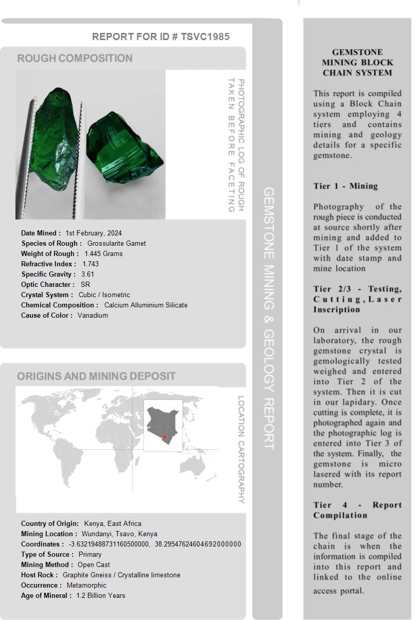 This Tsavorite is over 1.2 Billion Years old. After being removed from the vein and "knocked" to remove the host rock, this Tsavorite weighed 1.445 Grams. The photograph on the left, shows it as it looked at this stage in its journey. Tests showed it has a Specific Gravity of 3.61, an optic character of SR and it formed in the Othorhombic crystal system. Its Chemical Composition is Calcium Alluminium Silicate and its Cause of Color is Vanadium