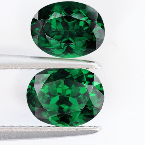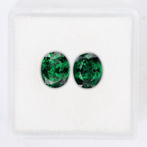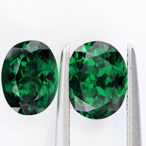 Top, intense, unadulterated emerald green. Unlike the Tanzanian deposit, this area of Kenya, the original deposit in Tsavo produces pure green stones with little or no yellow modifier. This pair of ovals are a case in point. Flawless. Well cut. A very fine pair of Tsavorites.