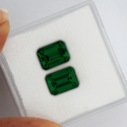 Truly superb in all respects. This exceptional matched pair of emerald cuts are everything top Tsavorite should be. Intense forest green, reminiscent of the finest Columbian Emeralds. Top clarity, excellent cutting and literally glowing with color.