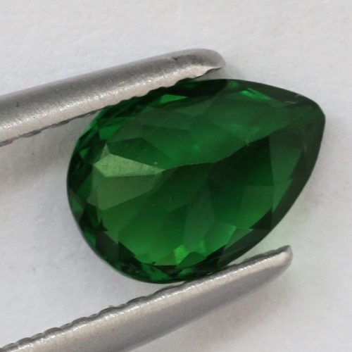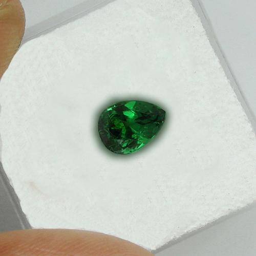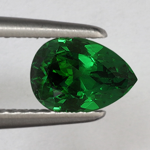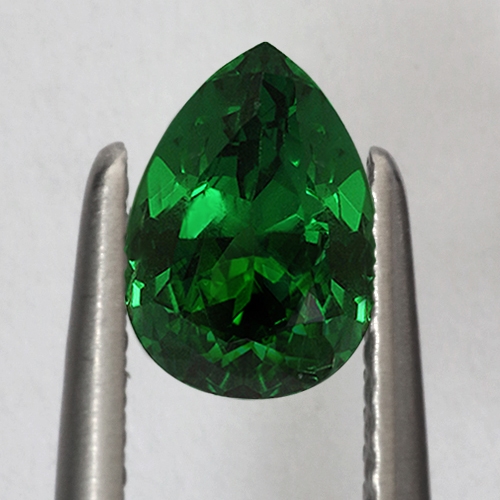 Gorgeous and rare. This 1.13 carat top grade Tsavorite pear is a fine piece. It boasts superb color and explosive brilliance. Superb.