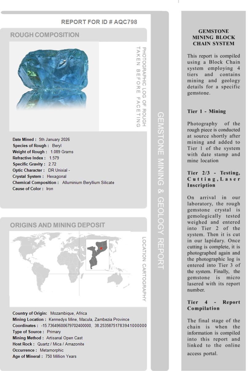 This Aquamarine is over 520 Million Years old. After being removed from the vein and "knocked" to remove the host rock, this Aquamarine weighed 1.089 Grams. The photograph on the left, shows it as it looked at this stage in its journey. Tests showed it has a Specific Gravity of 2.72, an optic character of DR Unixial - and it formed in the Othorhombic crystal system. Its Chemical Composition is Alluminium Beryllium Silicate and its Cause of Color is Iron