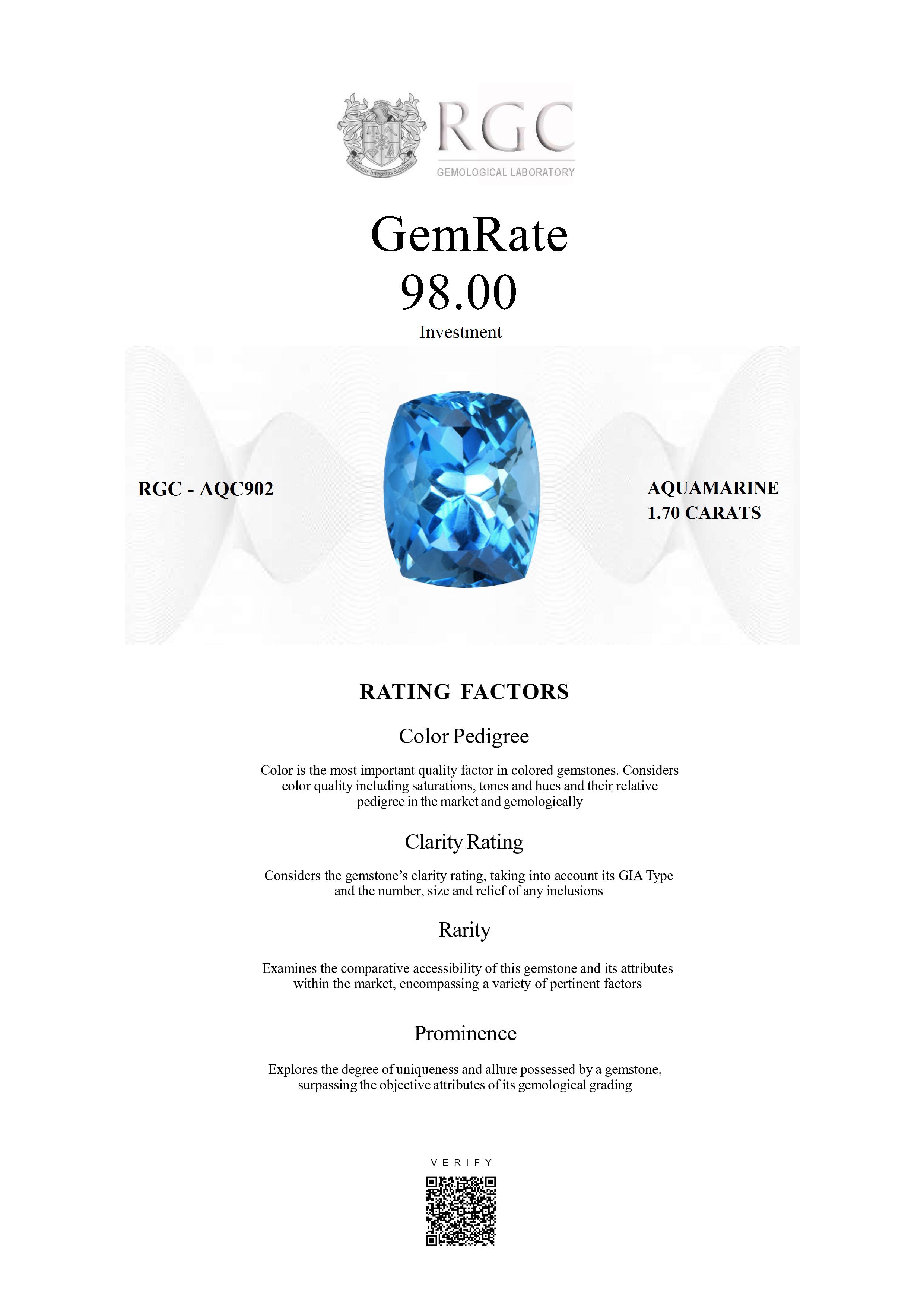 The RGC GemRate is a revolutionary system that addresses the importance and difficulty of comparing different colored gemstones with their peers in the marketplace. It assesses a wide variety of factors that exist in the marketplace and gemologically to classify gems in their genre using a standardized rating system. These factors are myriad but include quantifiable factors like color grade, clarity and cut, rarity factors examining relative rarity and also qualitative factors such as prominence, which examines the degree to which a gemstone stands out and captivates beyond just its measurable quality traits. It's essentially the stone's ability to catch attention and distinguish itself from others.