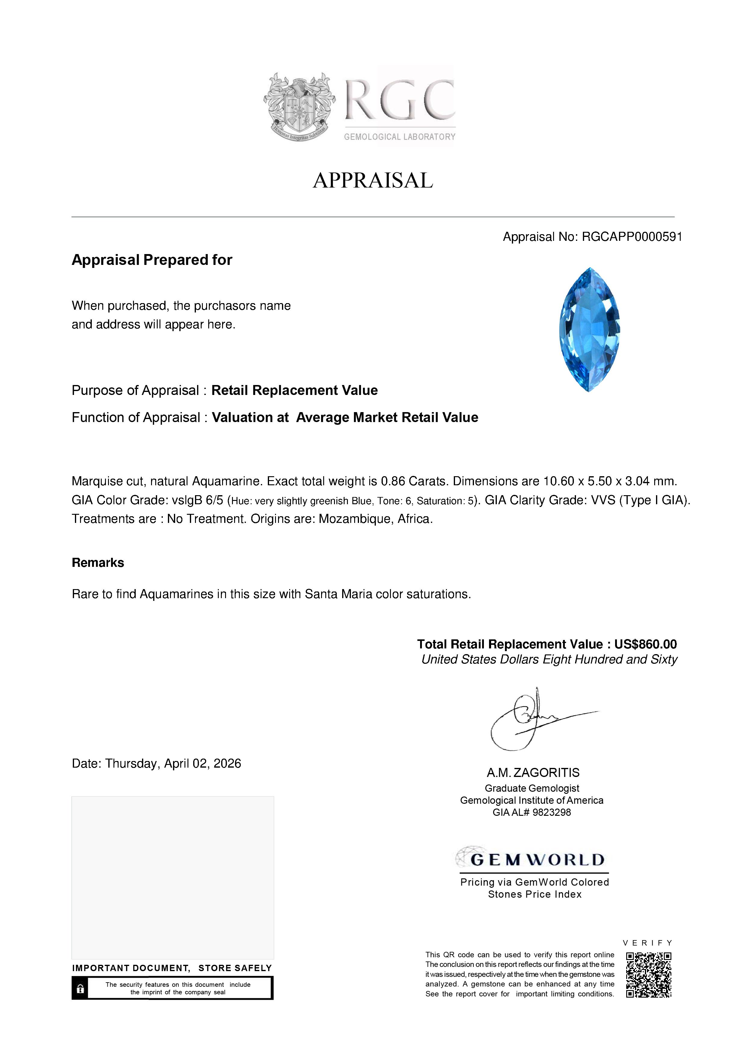 Another beauty from Mozambique. At 0.86 carats, it is not a large stone, but what it lacks in size, it makes up for with sheer presence. Principally, its color is incredible - a wonderful deeply saturated blue known as "Santa Maria Afrique".Flawless and natural - no heat. If you are looking for a small, deeply saturated Aquamarine and have been disappointed with the proliferation of pale colored stones out there, then this is for you.