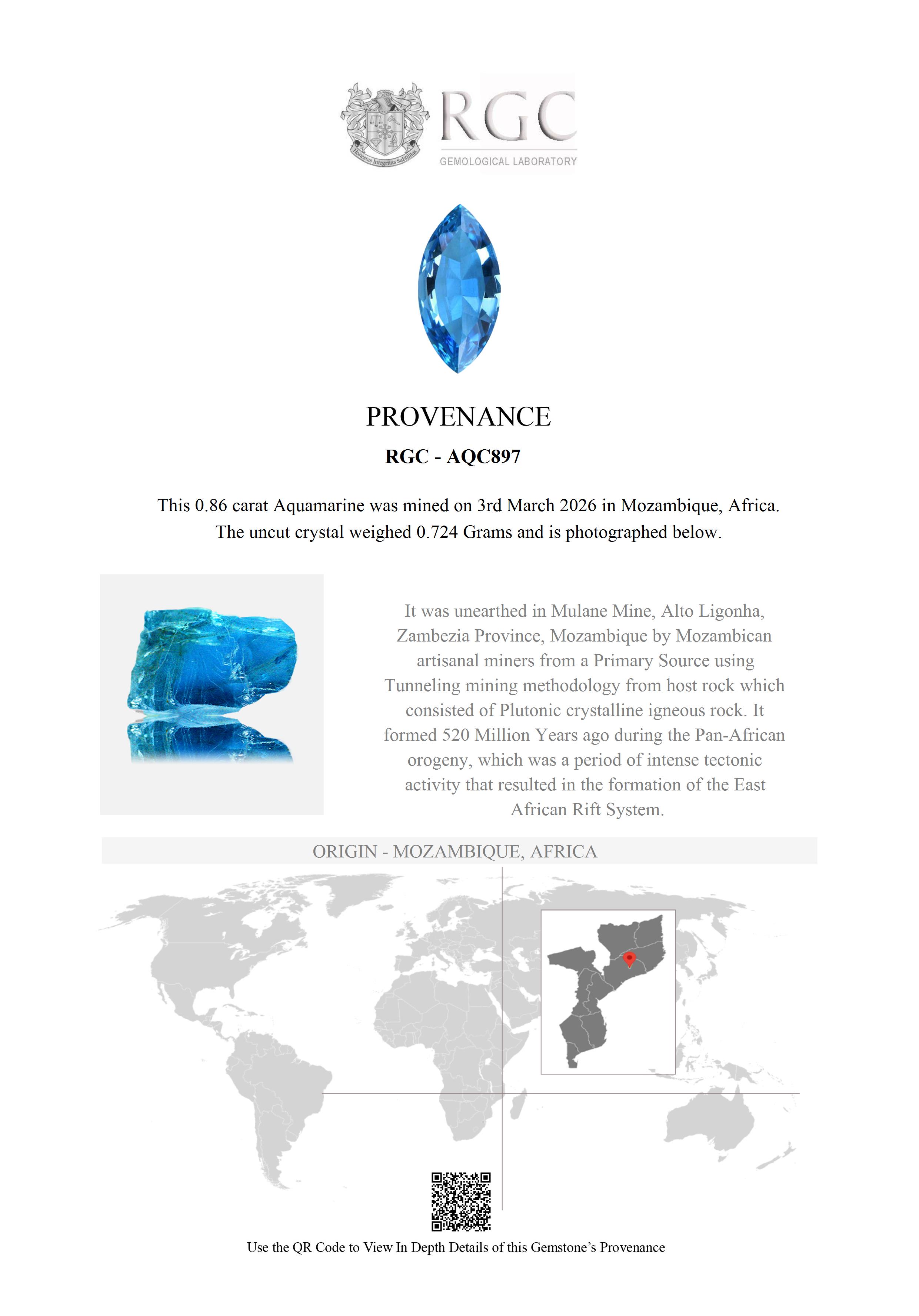 Once mined, gemologists from The Rare Gemstone Company negotiated to purchase the finest crystals of which this piece was one. It was then taken to our cutting offices and carefully cut to international standards. Because these gems are highly dichroic (meaning that they have different colors on different axes of the crystal), they have to be carefully cut to get the best color. The aquamarines from this deposit are deep blue on one axis, and light green on the other. If the stone is cut with the green axis facing up, then the blue will be far less prominent, resulting in an inferior stone. Hence the cutter had to be very careful to cut on the correct axis to maximize the color. Often this axis is the smaller axis resulting in a smaller stone than would have been achieved cutting on the greener axis and this was the case with this stone. The result was this spectacular, rare Aquamarine.