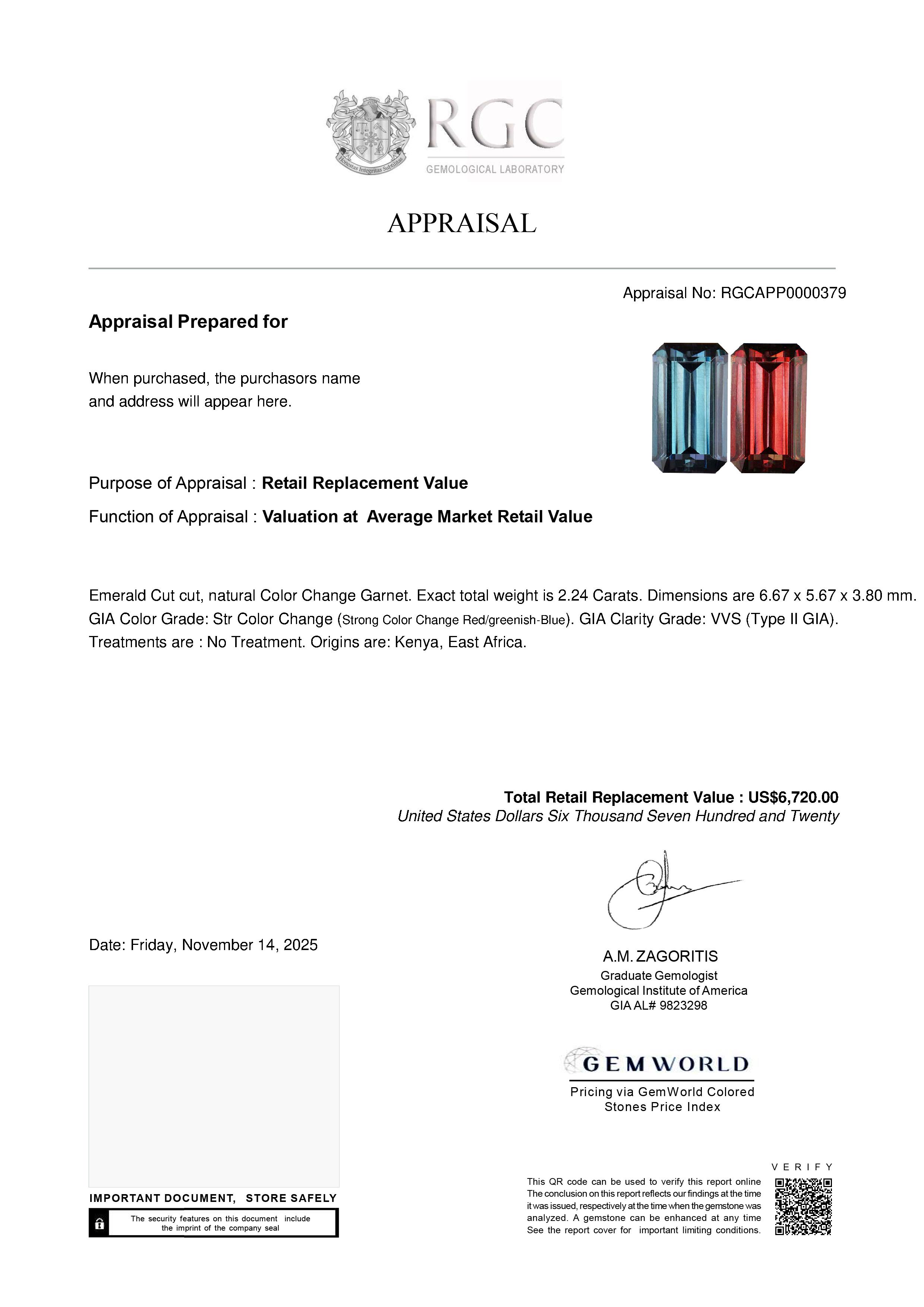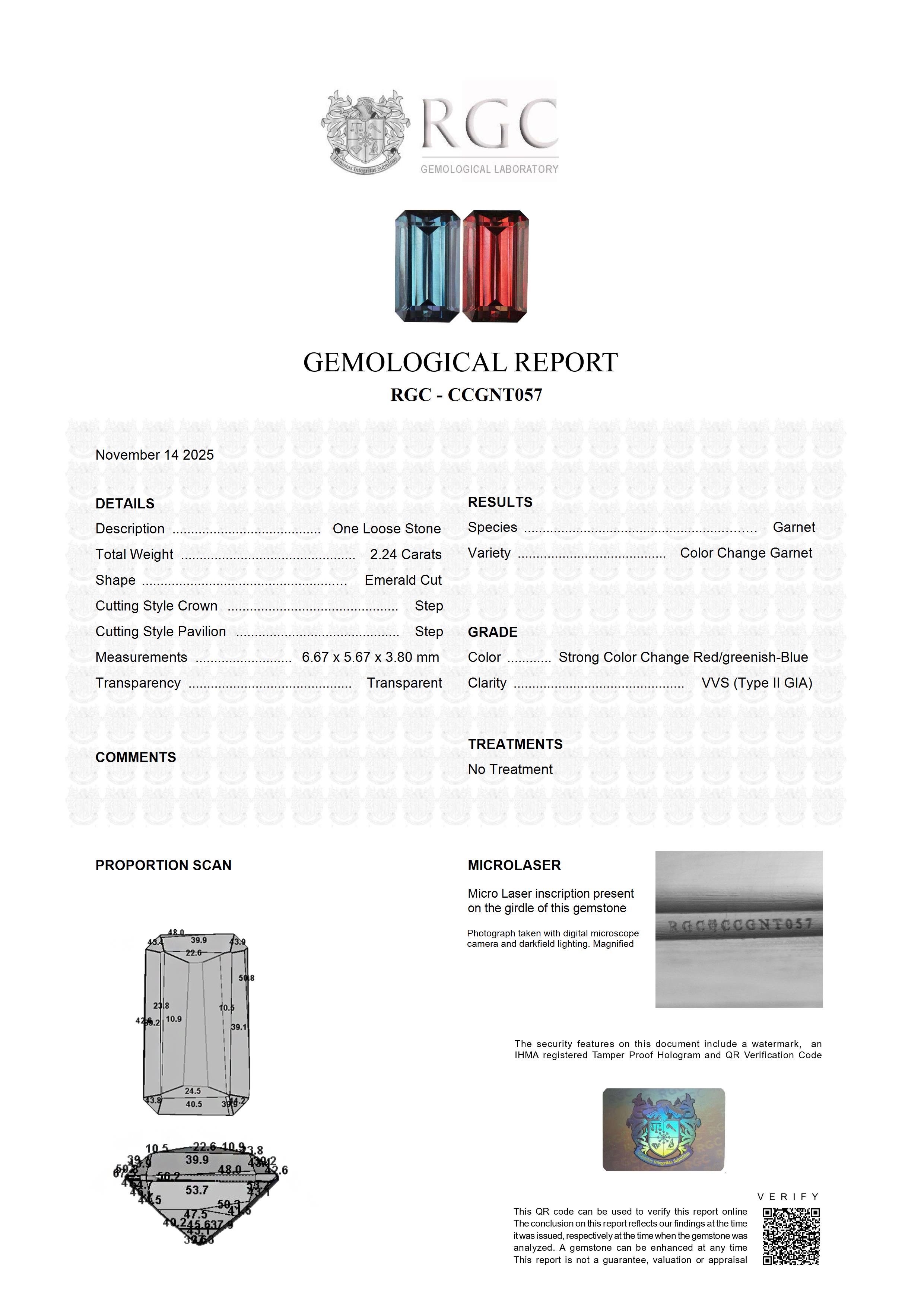 Perfection. This is the pinnacle of the genre. This incredible 2.24 carat displays a stunning "open" blue with a hint of green in daylight (it actually looks like a fine indicolite) and explodes into an intense red under incandescent. It displays a robust, complete change that would be the envy of the finest Alexandrite but without the price tag. High clarity - clean except for some light relief needles crossing at 45 degrees - classic mark of natural garnet. These are only visible at high magnification. This is a truly rare and special gemstone.