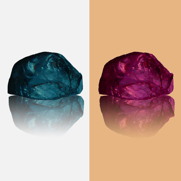 What followed is the classic tale of mining rushes. Hundreds of small-scale miners descended upon the area from nearby mines and started producing material - the very best of which rivals the finest from Madagascar - changing from a teal (blue-green) in fluorescent light to pinkish-purplish-red in incandescent light.