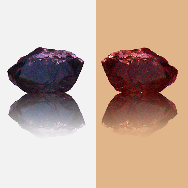 This stone displays a nice medium strong change/shift from red in incandescent light to a purplish red in daylight. Whilst it does not have the complete change seen in the finest of this genre, this is still considered a rare phenomenon in a garnet and makes for a great "mood changing" stone.