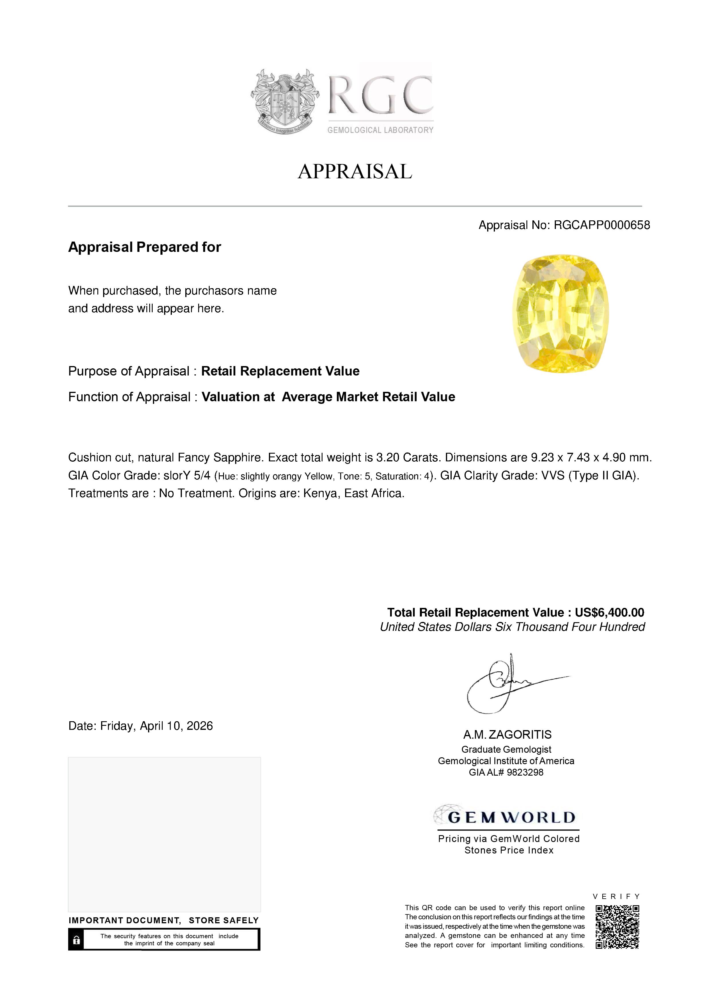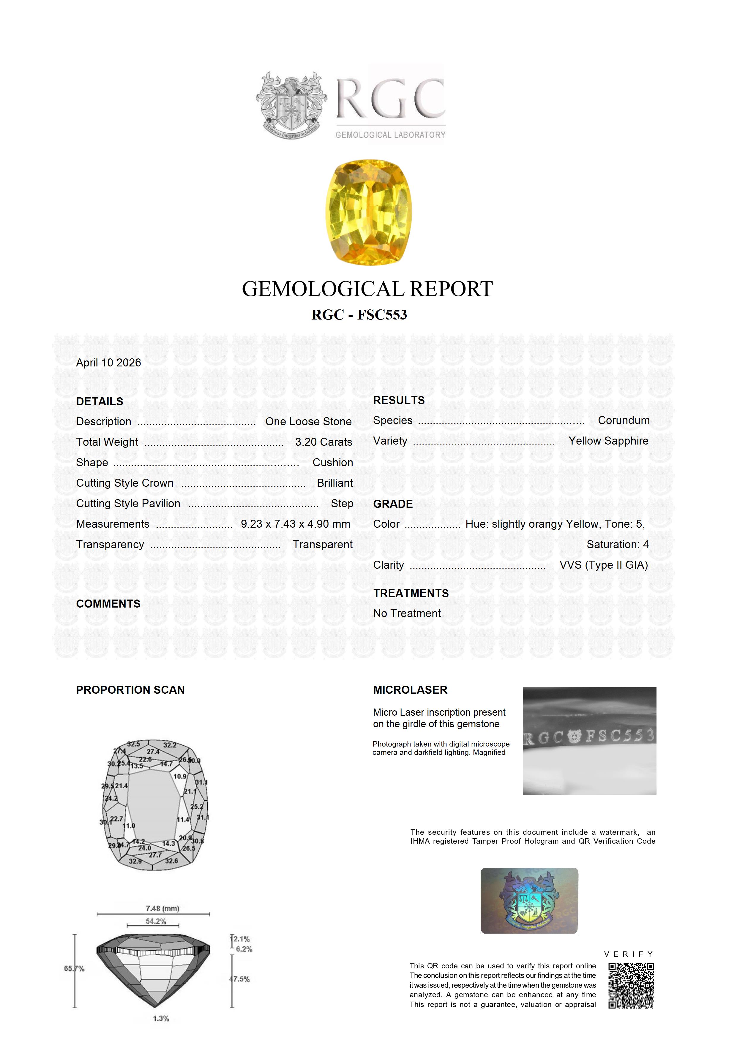 A rare, untreated flawless Canary Yellow Sapphire of 3.20 carats.