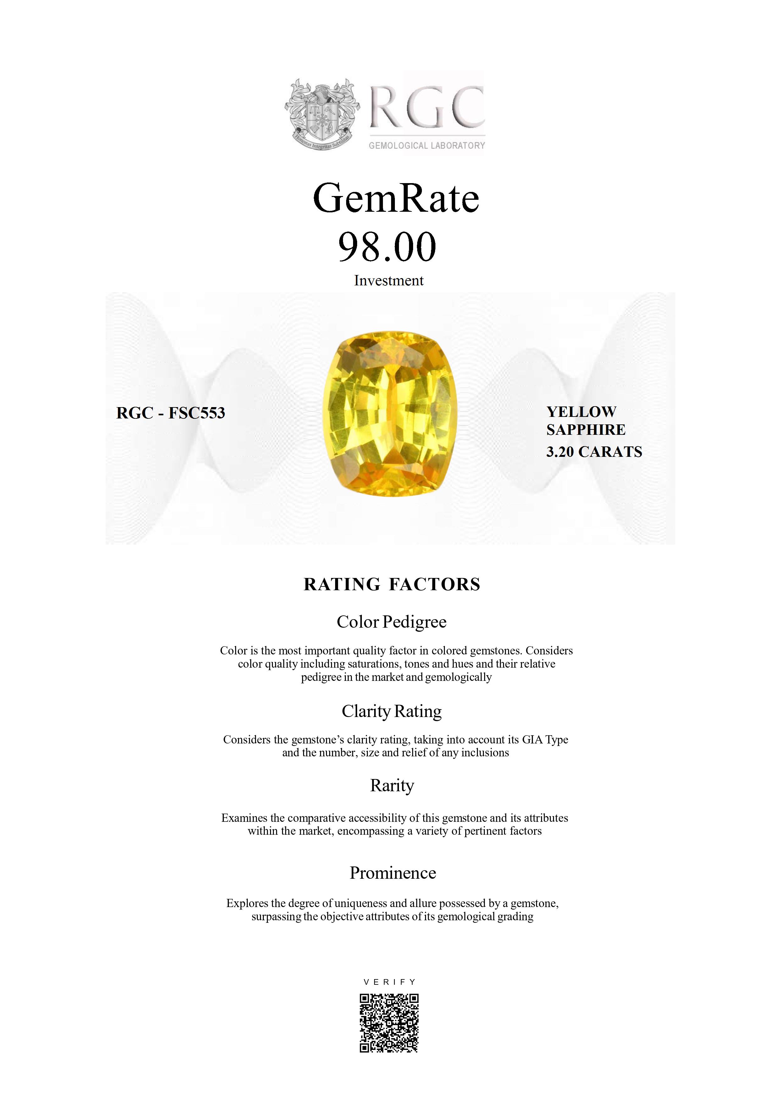 The RGC GemRate is a revolutionary system that addresses the importance and difficulty of comparing different colored gemstones with their peers in the marketplace. It assesses a wide variety of factors that exist in the marketplace and gemologically to classify gems in their genre using a standardized rating system. These factors are myriad but include quantifiable factors like color grade, clarity and cut, rarity factors examining relative rarity and also qualitative factors such as prominence, which examines the degree to which a gemstone stands out and captivates beyond just its measurable quality traits. It's essentially the stone's ability to catch attention and distinguish itself from others.