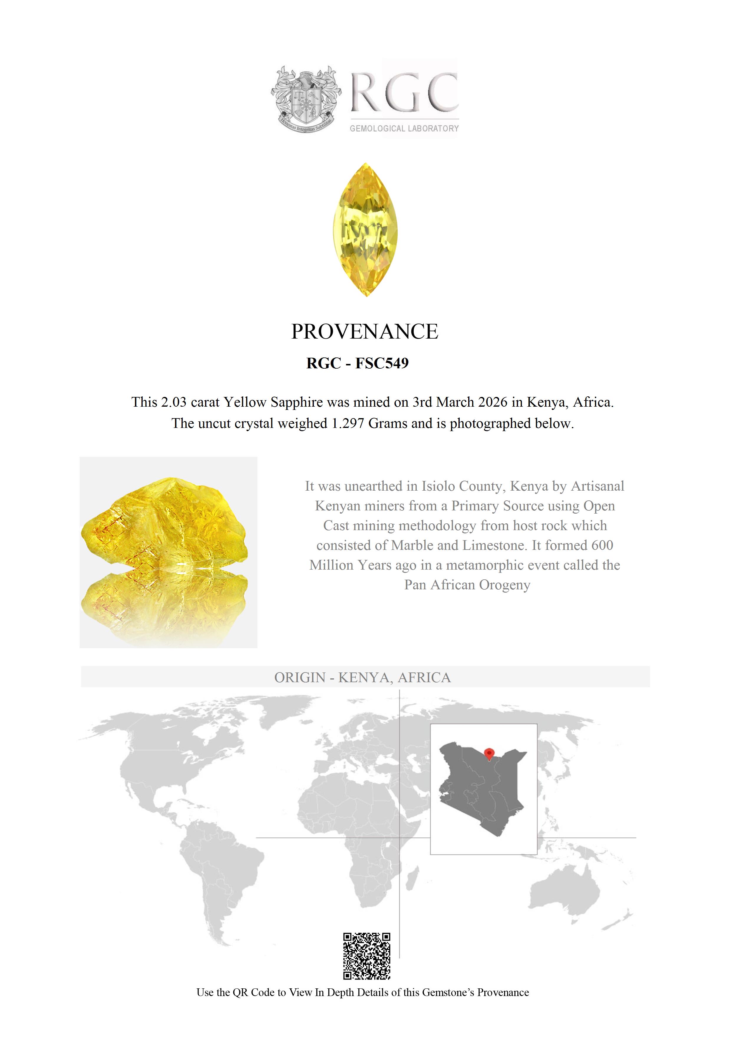The Northern Frontier District (or NFD) of Kenya is a hot, dusty barren wilderness sparsely populated by nomadic tribesmen. It is here, among the short scrub and rock that this Fancy Yellow Sapphire was found in an area called Garba Tulla.