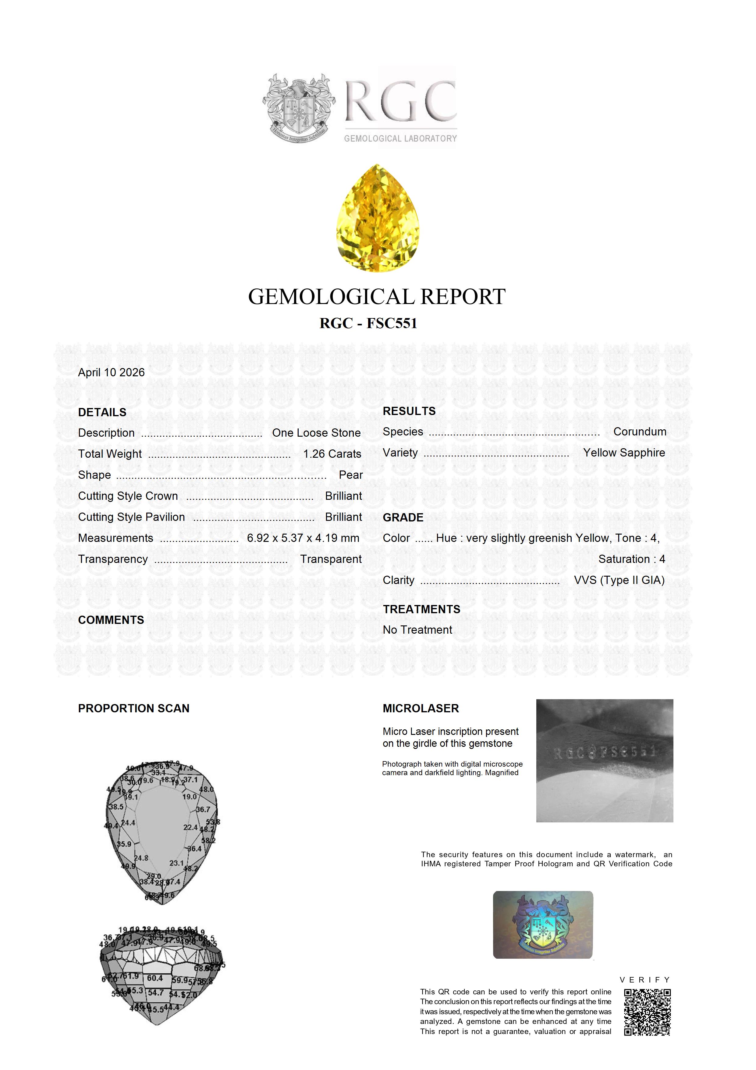 This 1.26 carat Canary Yellow Sapphire is beautiful. It really glows and glitters with an inrense "canary" yellow reminiescent of a Canary Diamond. Flawless. It is 100% natural - no heat or any other treatment. Gorgeous