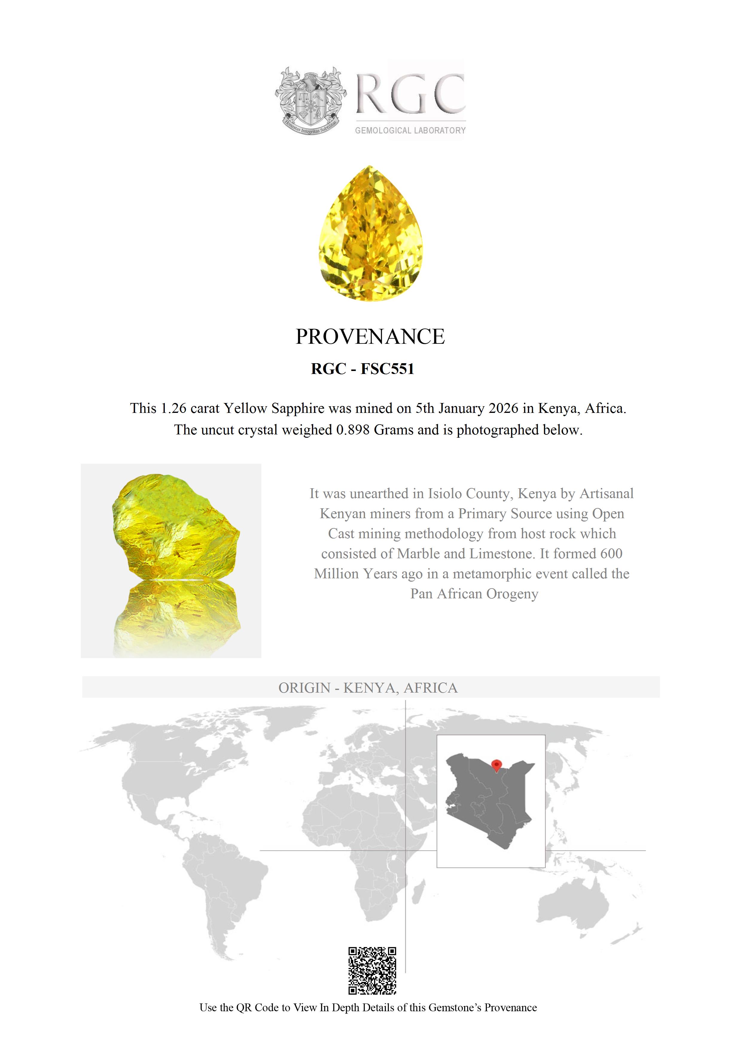 The Northern Frontier District (or NFD) of Kenya is a hot, dusty barren wilderness sparsely populated by nomadic tribesmen. It is here, among the short scrub and rock that this Fancy Yellow Sapphire was found in an area called Garba Tulla.