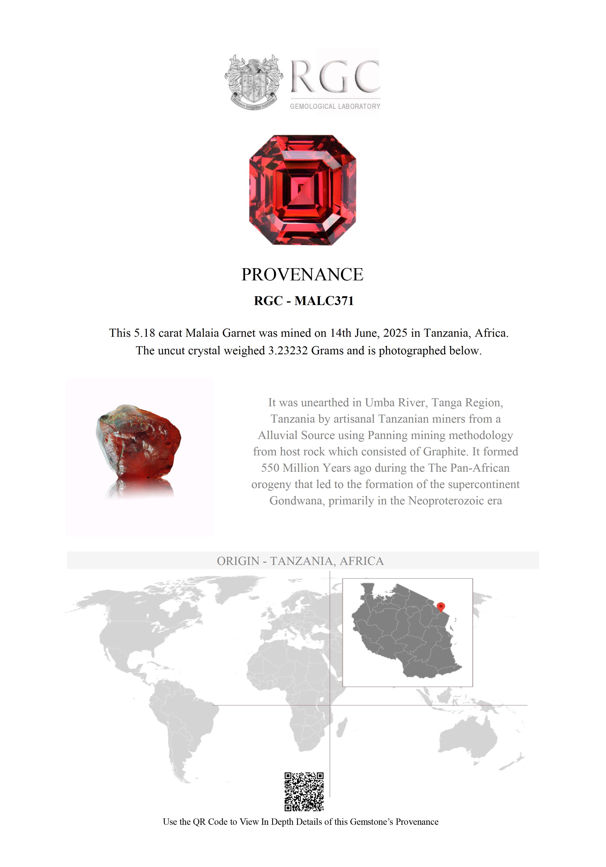 Near the small village of Mnazi, in the Usambara Mountains of Tanzania, a dirt track winds down the valley following the northern tributary of the famous Umba River. From here the road heads southwards and then eastwards to the Gerevi Hills. As the Umba River meanders through these hills it has for centuries deposited a gem gravel on the twists and bends of the river. It is among these deposits that this Malaia garnet was found.
