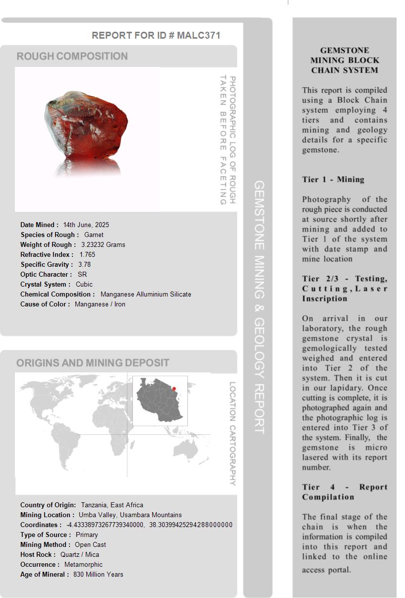 This Malaia Garnet is over 550 Million Years old. After being removed from the vein and "knocked" to remove the host rock, this Malaia Garnet weighed 3.23232 Grams. The photograph on the left, shows it as it looked at this stage in its journey. Tests showed it has a Specific Gravity of 3.78, an optic character of SR and it formed in the Othorhombic crystal system. Its Chemical Composition is Manganese Alluminium Silicate and its Cause of Color is Manganese/Iron