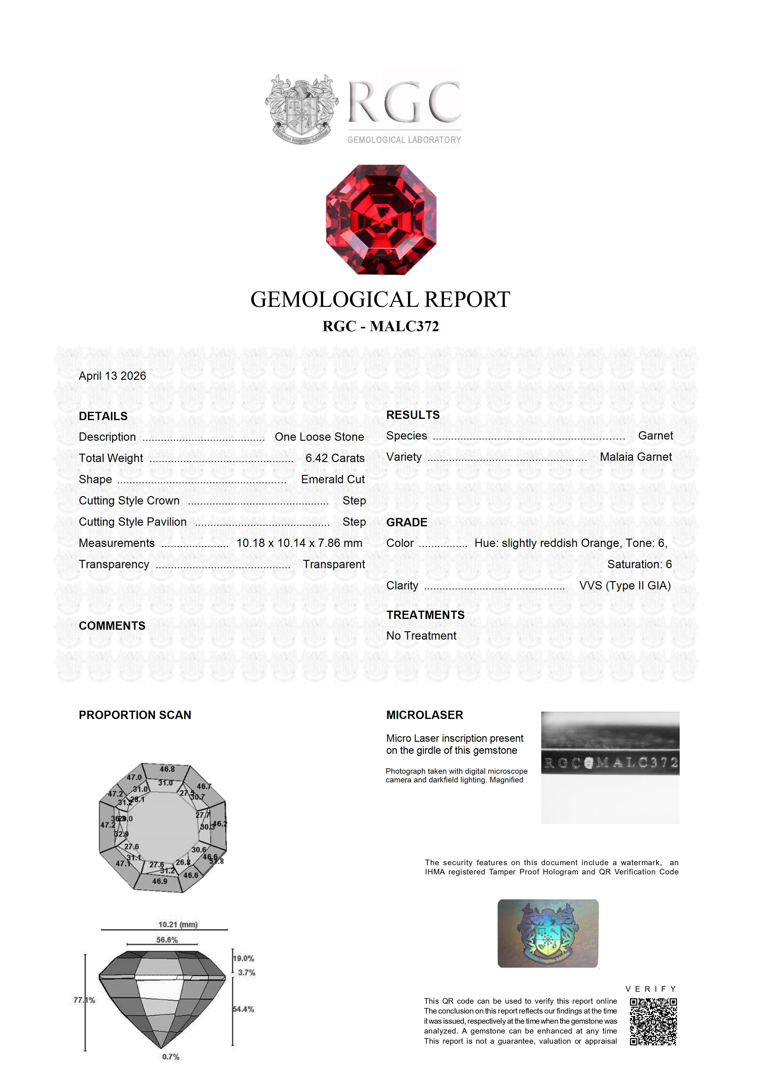A deep, intense almost velvety reddish orange hue beguiles the eye in this flawless 6.42 carat Malaia Garnet. More of an "Octagon" than a classic Emerald cut, it displays large corners which give it a very unique look. Would make a stunning, one of a kind ring or pendant.