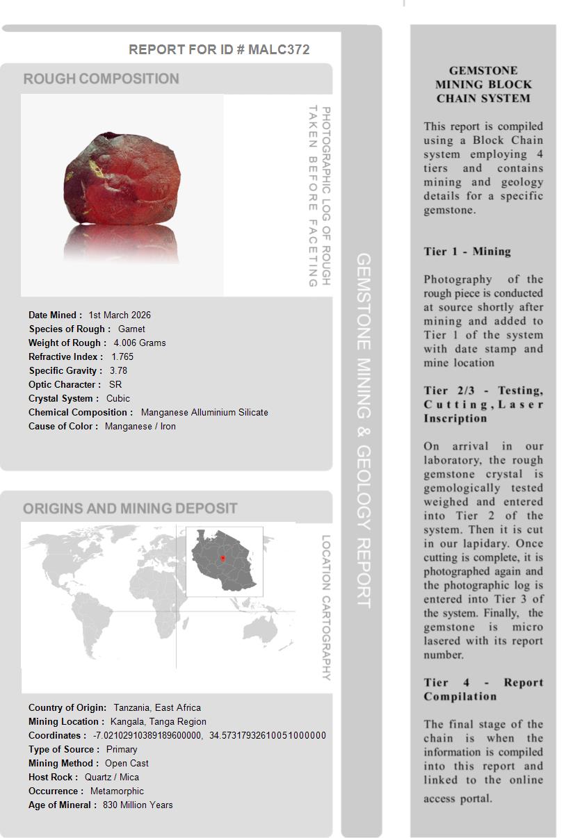 This Malaia Garnet is over 480 Million Years old. After being removed from the vein and "knocked" to remove the host rock, this Malaia Garnet weighed 4.006 Grams. The photograph on the left, shows it as it looked at this stage in its journey. Tests showed it has a Specific Gravity of 3.78, an optic character of SR and it formed in the Othorhombic crystal system. Its Chemical Composition is Manganese Alluminium Silicate and its Cause of Color is Manganese/Iron