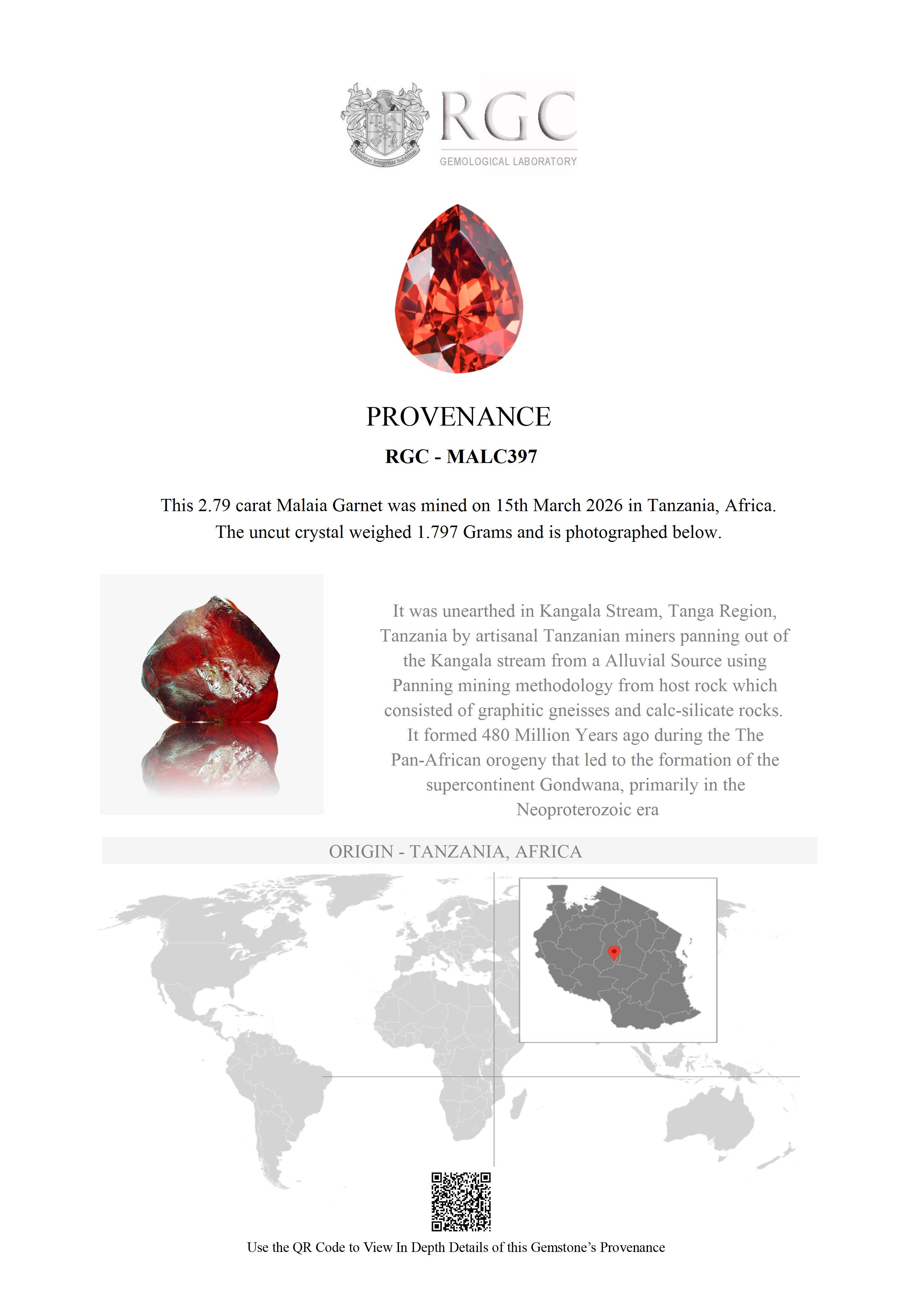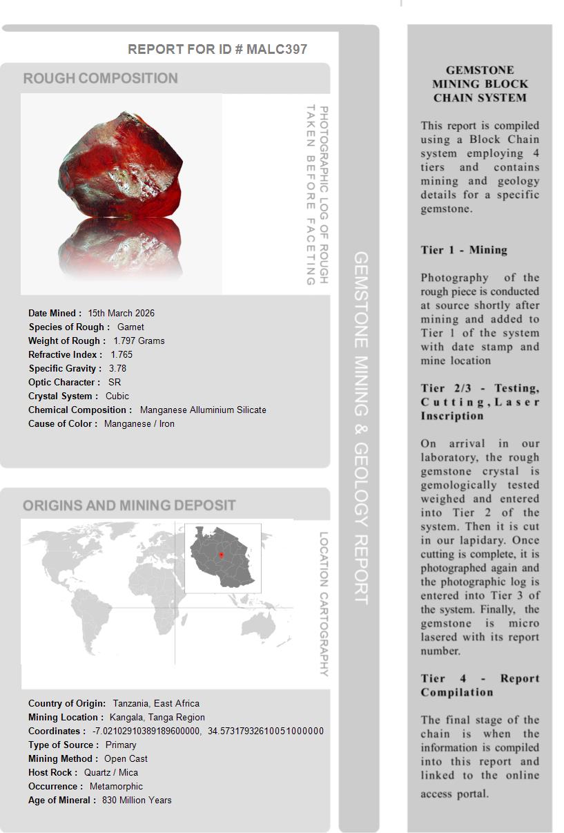 This Malaia Garnet is over 480 Million Years old. After being removed from the vein and "knocked" to remove the host rock, this Malaia Garnet weighed 1.797 Grams. The photograph on the left, shows it as it looked at this stage in its journey. Tests showed it has a Specific Gravity of 3.78, an optic character of SR and it formed in the Othorhombic crystal system. Its Chemical Composition is Manganese Alluminium Silicate and its Cause of Color is Manganese/Iron