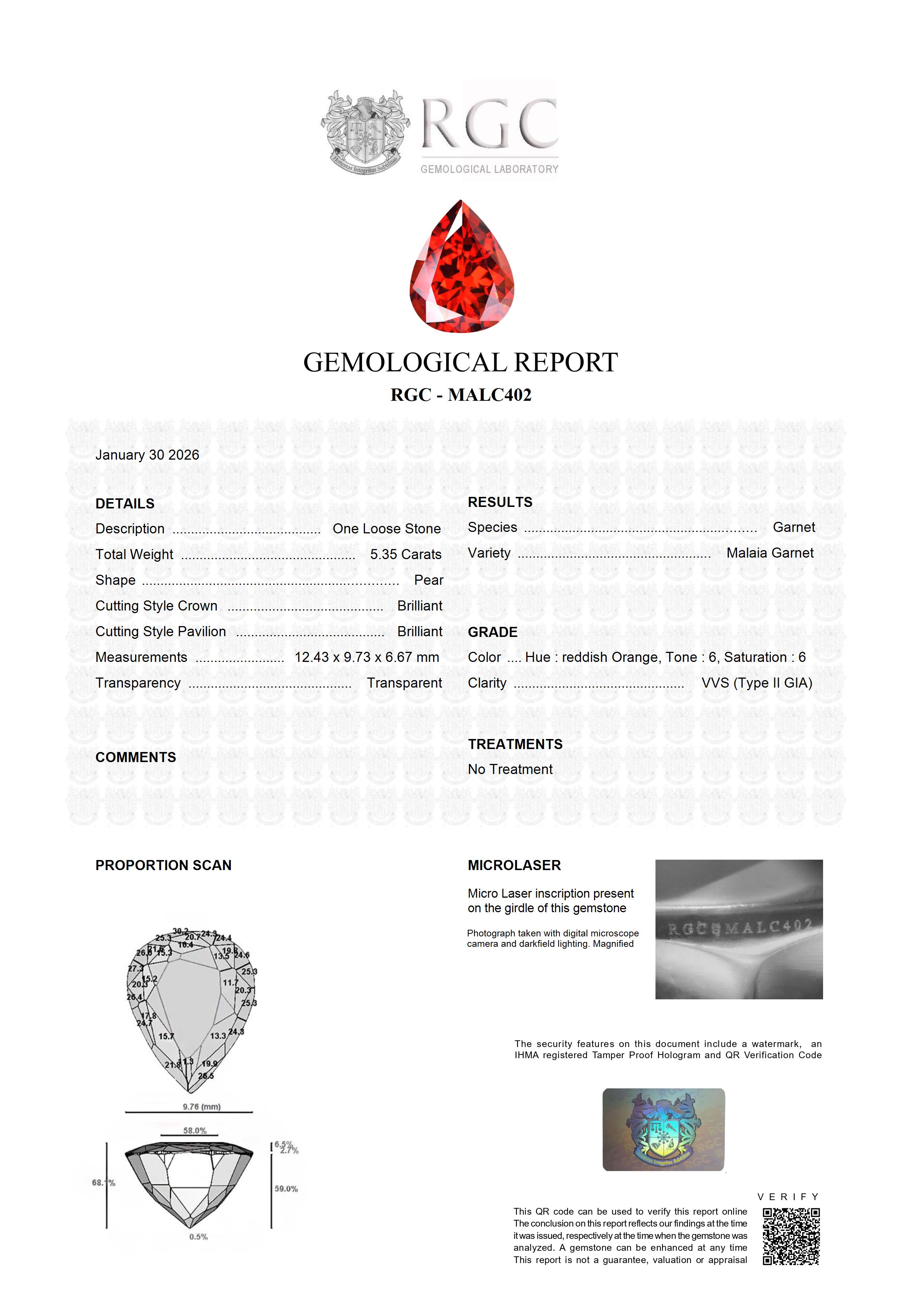 This captivating Pear Brilliant Malaia Garnet, weighing in at 5.35 carats, radiates with a rich, deeply saturated reddish orange color, exuding a breath-taking natural beauty. In line with the current year's trend, its mesmerizing earthy tones are exceptionally popular and highly sought-after. The gem showcases an exquisite splash of color that seamlessly blends the warmth of rich earth tones with striking sophistication. An epitome of timeless elegance, this Malaia Garnet is a tangible reflection of refined luxury. Top clarity.