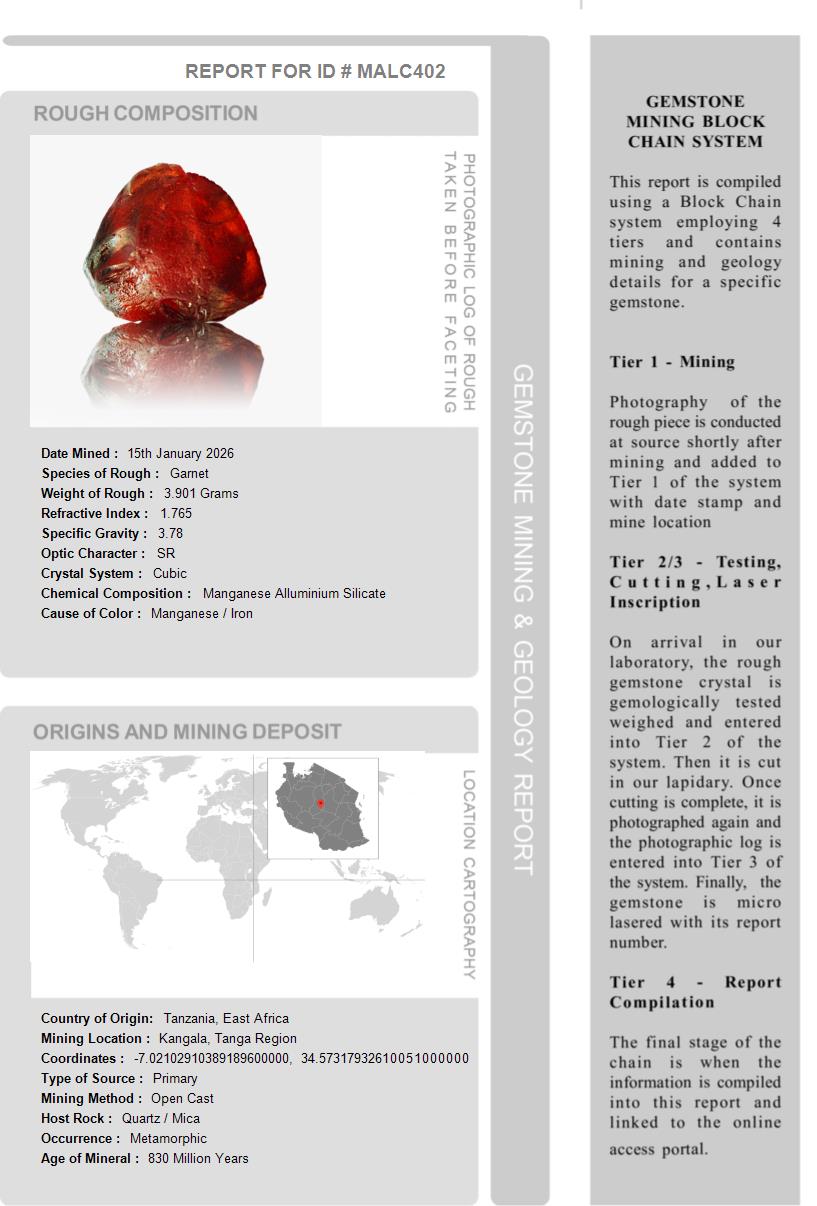 This Malaia Garnet is over 480 Million Years old. After being removed from the vein and "knocked" to remove the host rock, this Malaia Garnet weighed 3.901 Grams. The photograph on the left, shows it as it looked at this stage in its journey. Tests showed it has a Specific Gravity of 3.78, an optic character of SR and it formed in the Othorhombic crystal system. Its Chemical Composition is Manganese Alluminium Silicate and its Cause of Color is Manganese / Iron