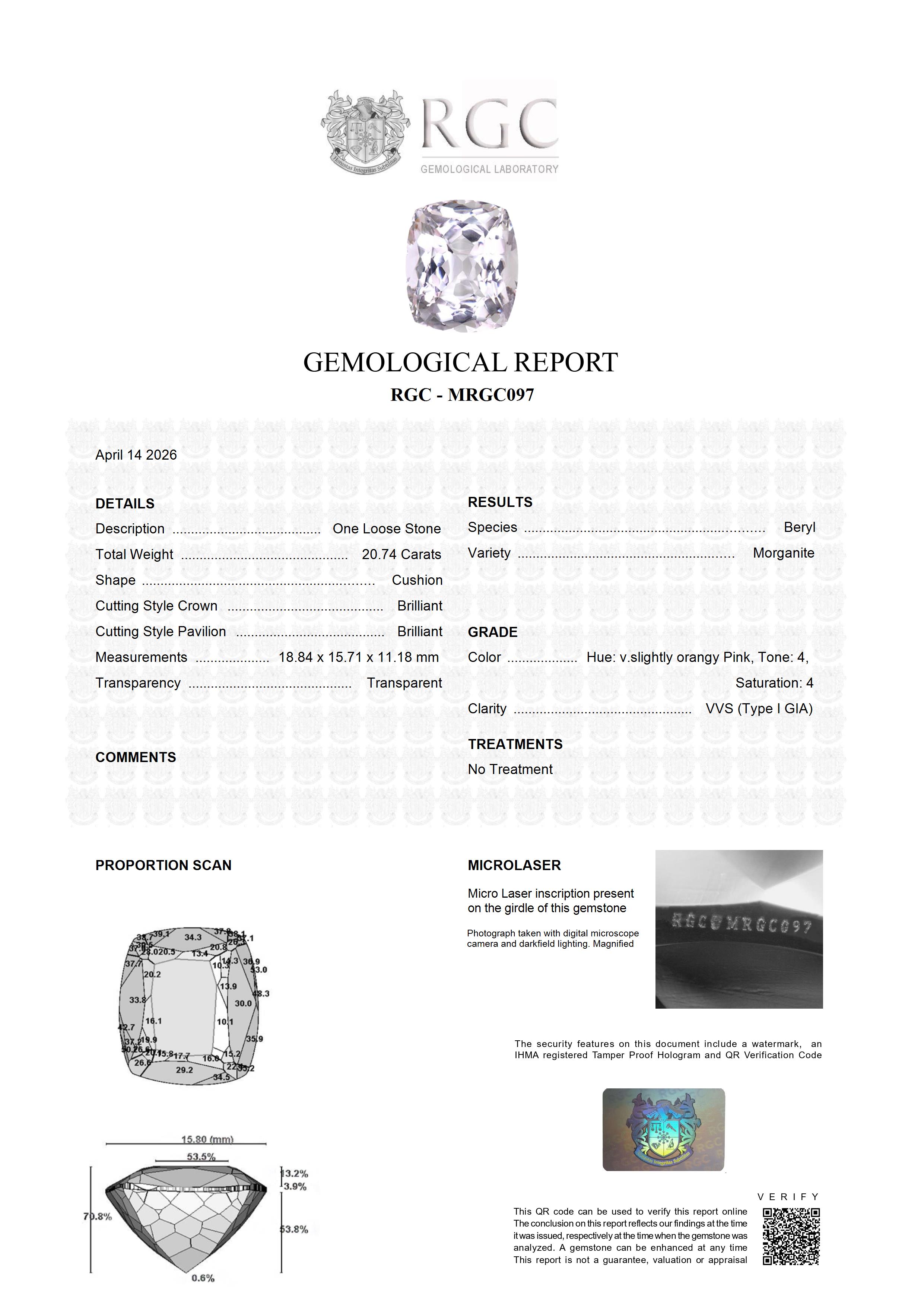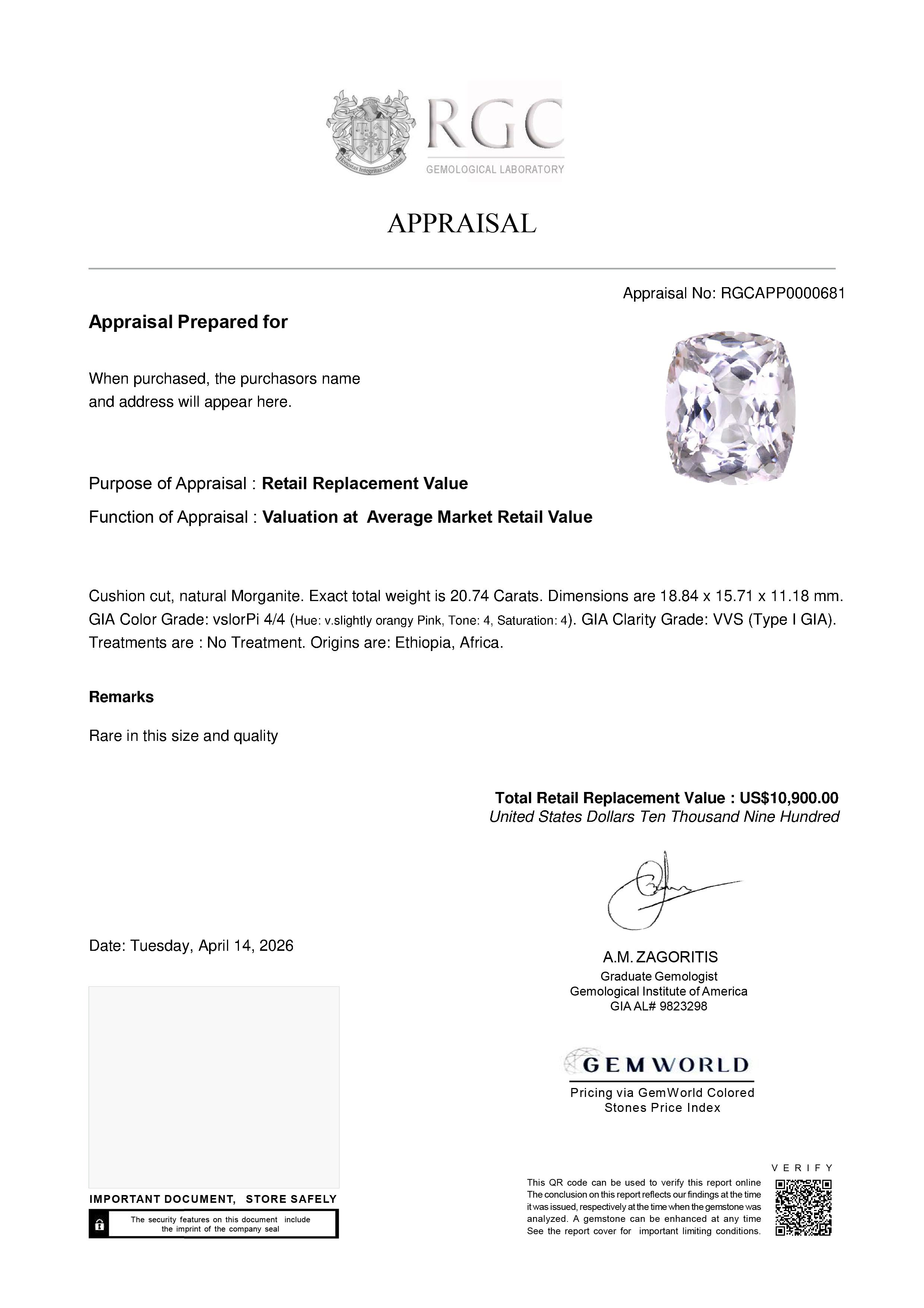 A stunning Ethiopian Morganite. At an impressive 20.74 carats, it commands respect. Completely natural - no heat and exploding with brilliance. A fine, delicate pink hue and flawless clarity complete the package. Very fine.