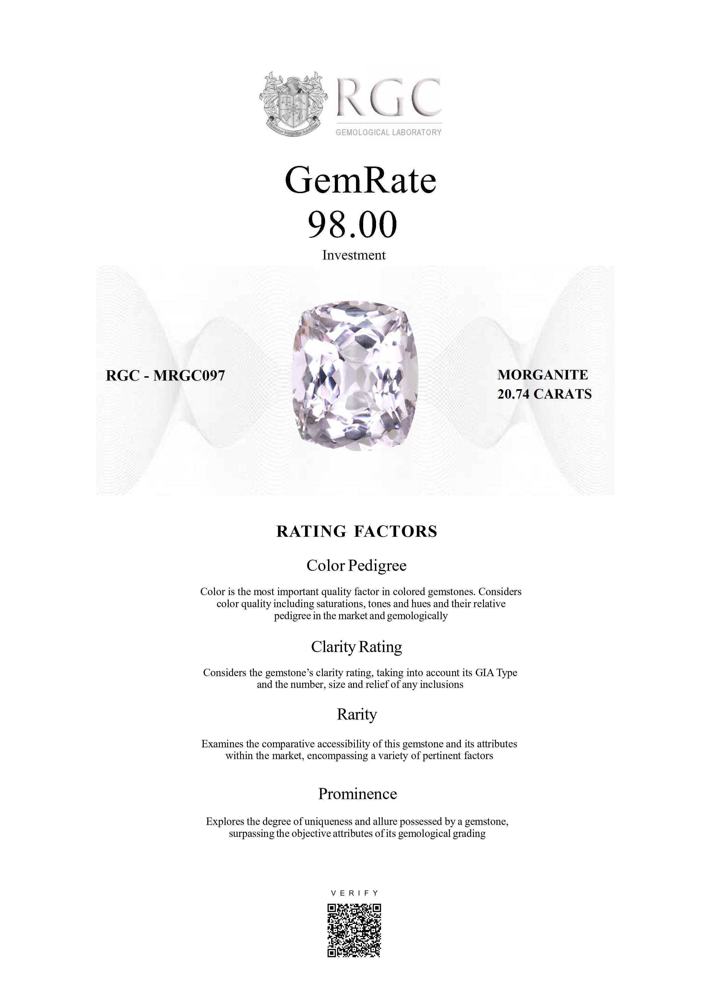 The RGC GemRate is a revolutionary system that addresses the importance and difficulty of comparing different colored gemstones with their peers in the marketplace. It assesses a wide variety of factors that exist in the marketplace and gemologically to classify gems in their genre using a standardized rating system. These factors are myriad but include quantifiable factors like color grade, clarity and cut, rarity factors examining relative rarity and also qualitative factors such as prominence, which examines the degree to which a gemstone stands out and captivates beyond just its measurable quality traits. It's essentially the stone's ability to catch attention and distinguish itself from others.