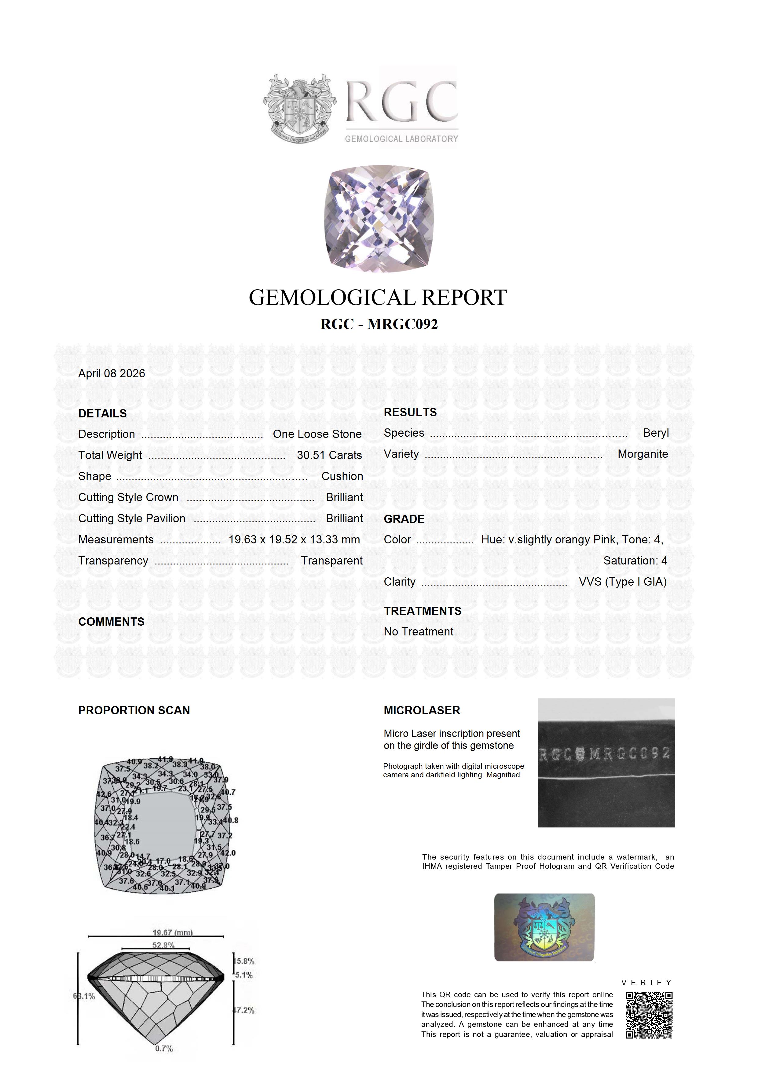 A very fine 30.51-carat Morganite of exceptional presence and beauty, this remarkable gemstone showcases enchanting pink hues of refined elegance. Its surface ignites with explosive brilliance, the result of expert precision cutting that maximizes light return and scintillation. Sparkling with vitality from every angle, it captures both delicacy and intensity in perfect balance. Stones of this size and quality are increasingly rare, making this Morganite a distinguished and highly desirable centerpiece for fine jewelry or discerning collectors.