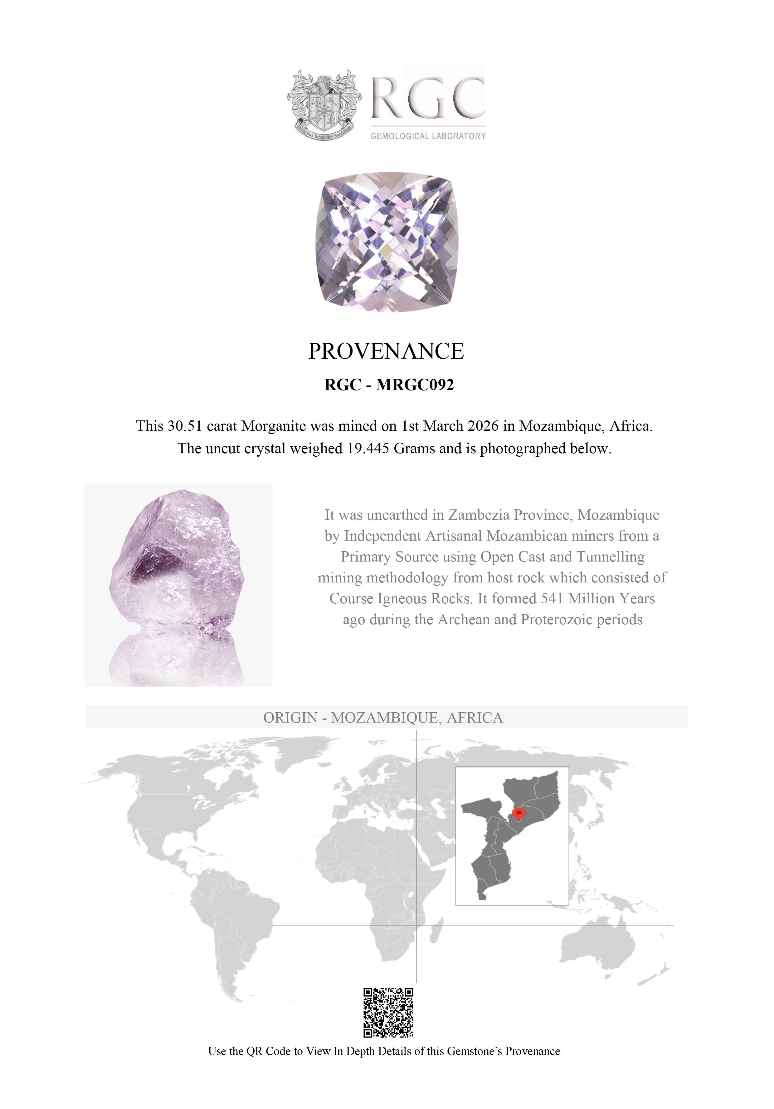 This mesmerizing Morganite hails from the remote African country of Mozambique. It formed hundreds of millions of years ago in the Archean and Proterozoic periods. In fact the entire geology of Mozambique is primarily extremely old Precambrian metamorphic and igneous crystalline basement rock, formed, in some cases more than two billion years ago.