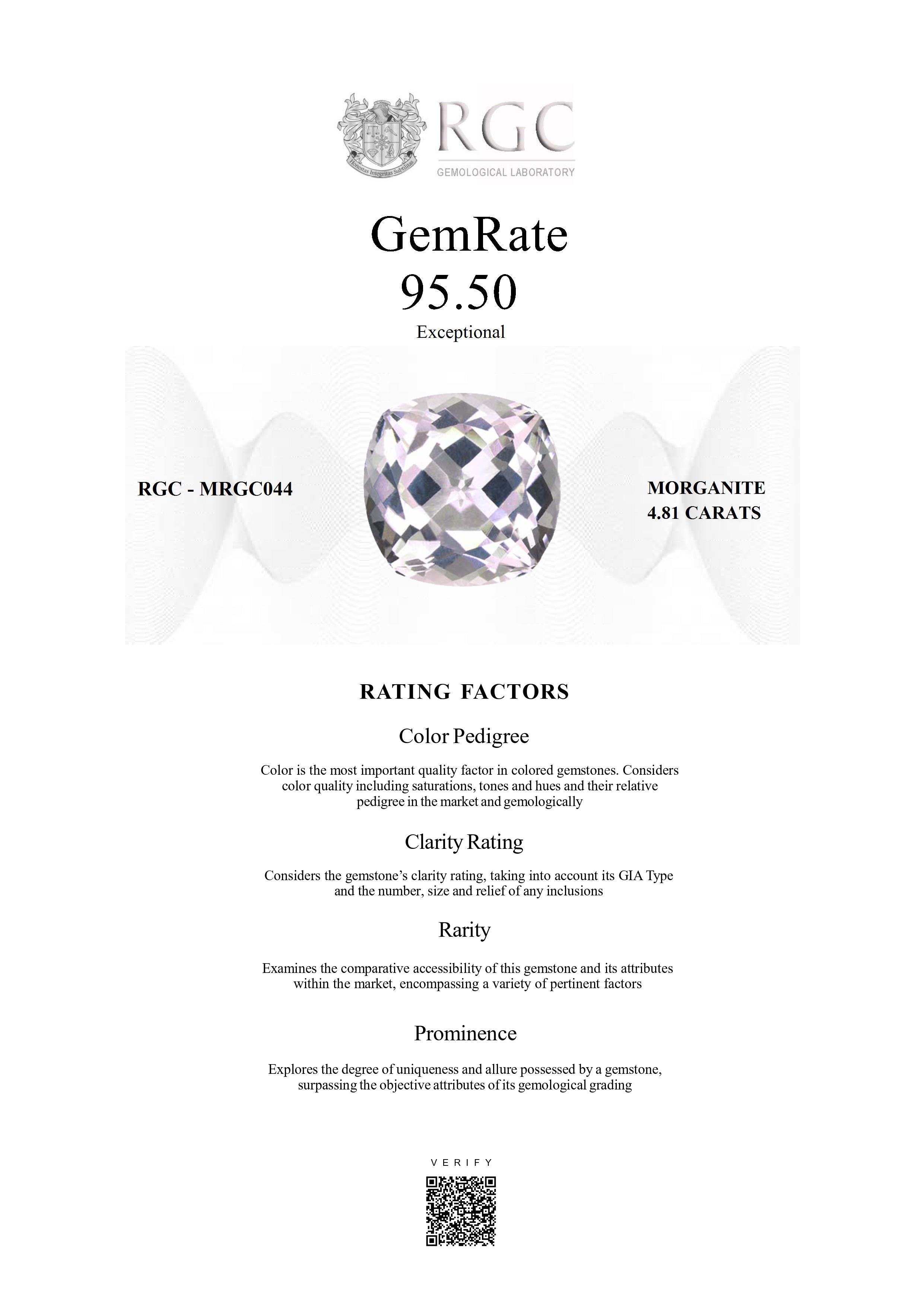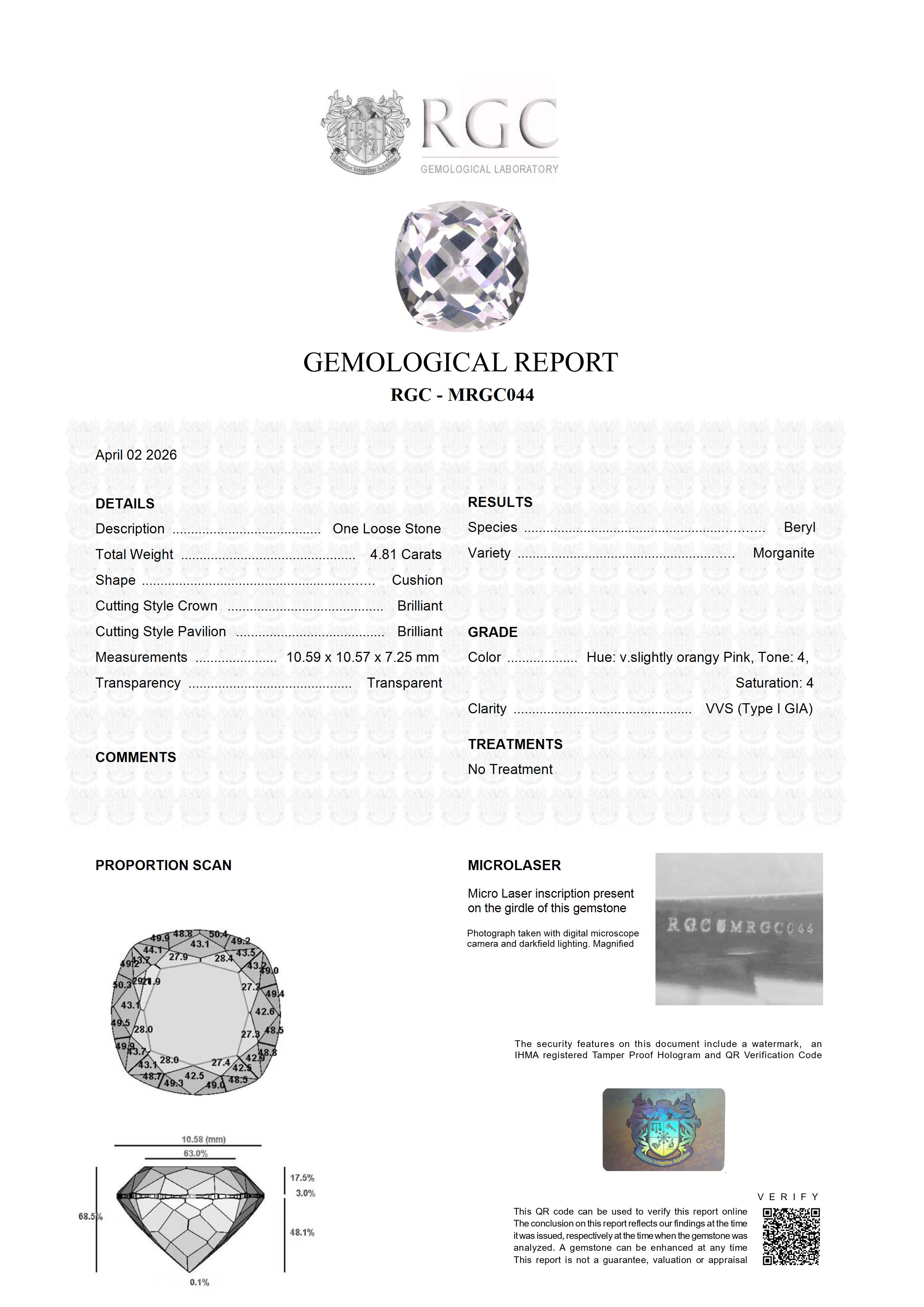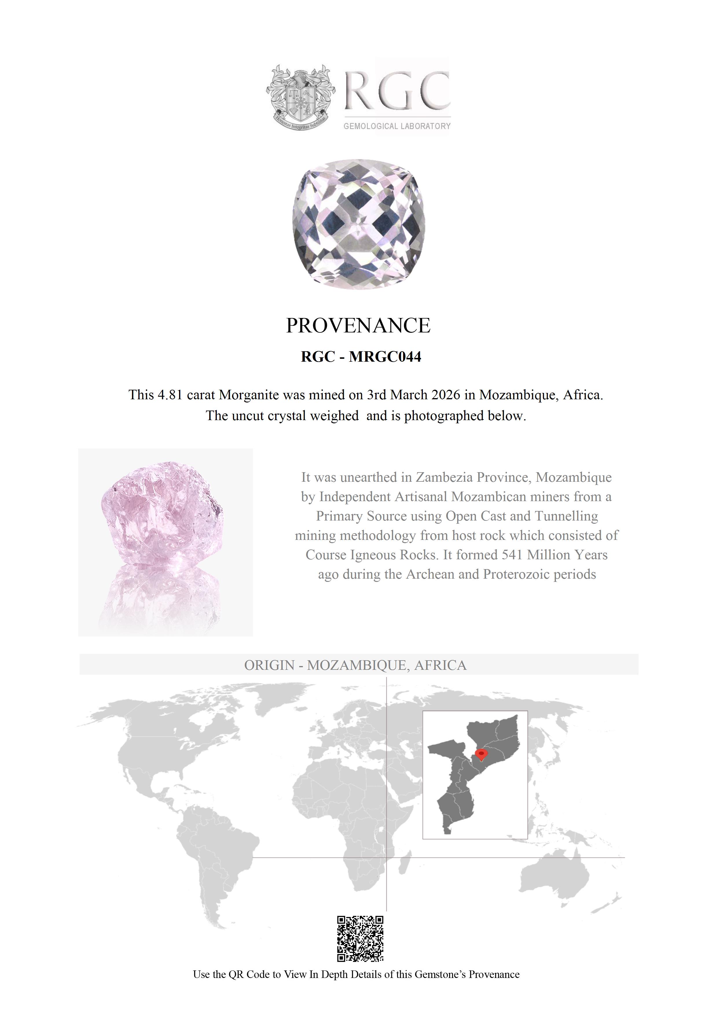 This exquisite 4.81-carat morganite, fashioned in a refined square cushion cut, is a superb example of top-grade material from Mozambique. Displaying an incredible icy pink hue, the gemstone radiates a delicate yet luminous color that is both modern and timeless. Its expertly executed cut maximizes light return, producing exceptional brilliance and a crisp, lively scintillation across every facet. With flawless clarity, the stone offers a pristine window into its luminous interior, enhancing its overall elegance and purity. Graceful yet striking, this morganite embodies sophistication and rarity, making it an ideal centerpiece for fine jewelry or a distinguished addition to any discerning collection.