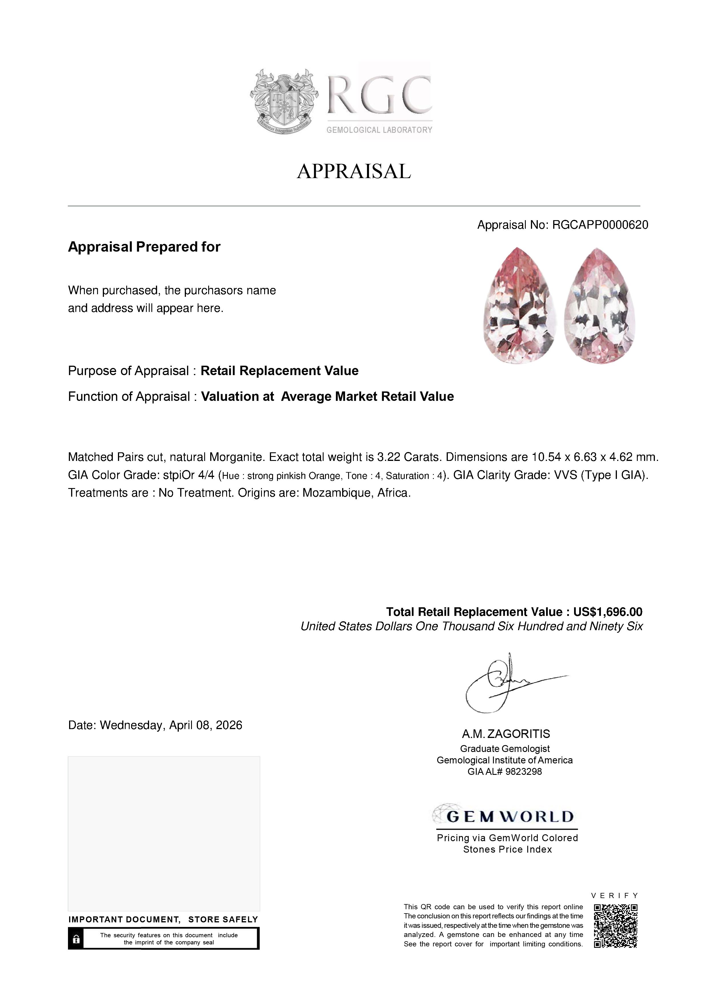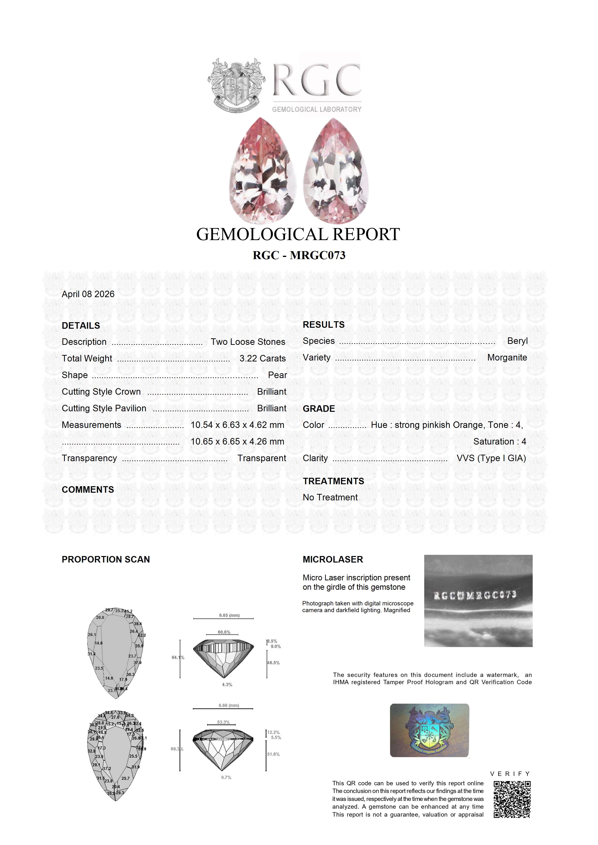 A stunning and very fine matched pair of Morganites, expertly selected for their exceptional harmony and beauty. Displaying top color saturation, these gemstones radiate intense, vivid pink-peach hues of remarkable richness and consistency. Their extraordinary brilliance is the result of masterful precision cutting, allowing light to dance effortlessly across each stone. Flawless in clarity, they offer pristine transparency and superior refinement. Sourced from Mozambique, this exquisite pair represents the pinnacle of elegance and rarity—perfectly suited for high-end, bespoke jewelry creations.