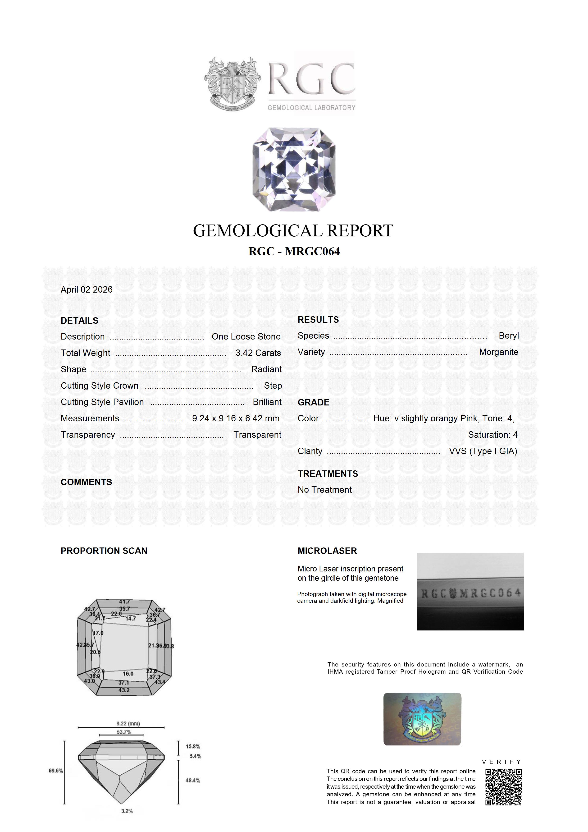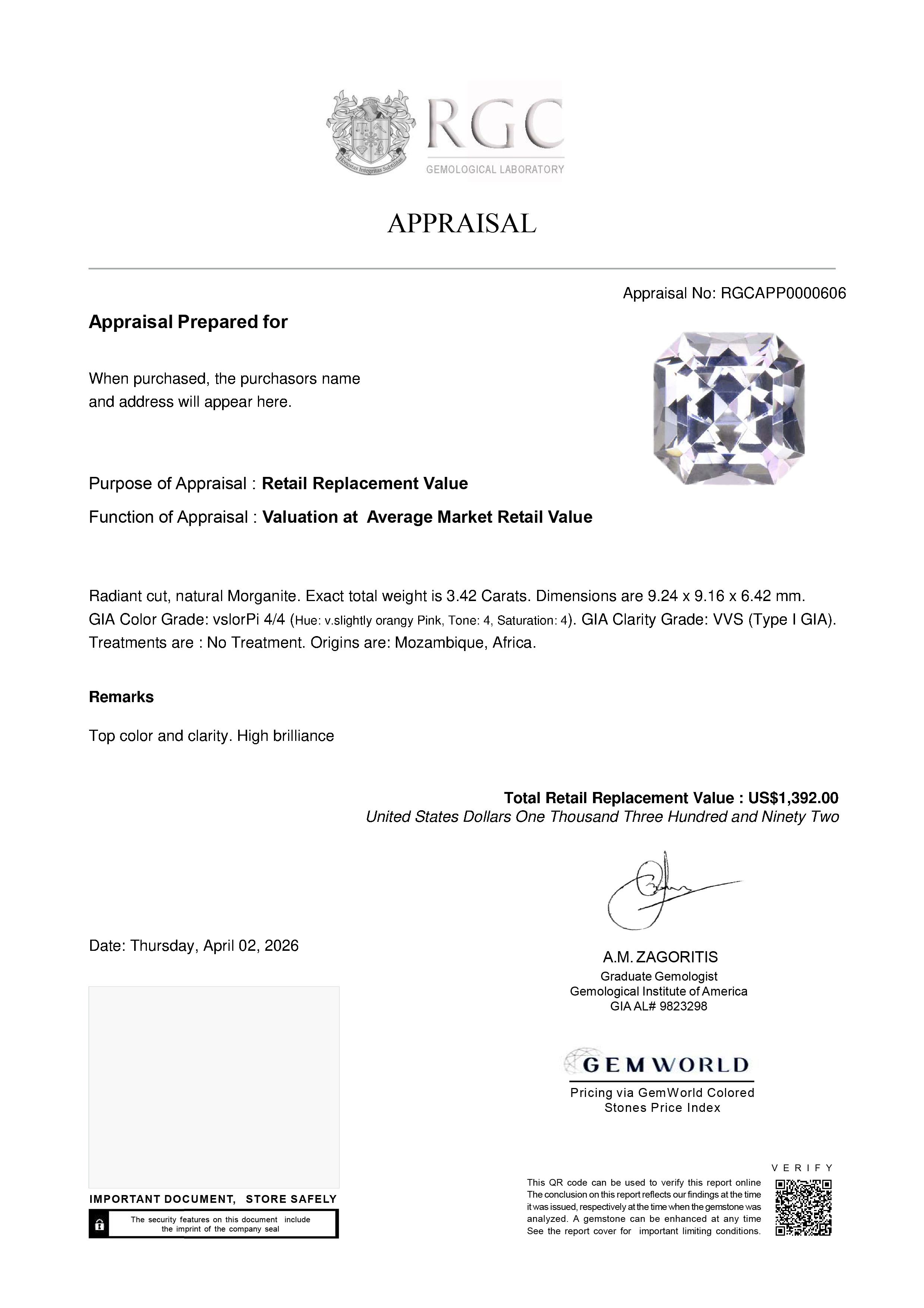 This exquisite morganite, expertly fashioned in a radiant cut, combines elegant, clean lines with a graceful, sophisticated shape. Its precision cutting maximizes fire and sparkle, creating a lively display of brilliance from every angle. The gemstone’s intoxicating icy pink hues exemplify top color, while flawless clarity ensures a pristine, uninterrupted interior that enhances its natural radiance. Sourced from premier Mozambique material, this morganite represents the finest quality and craftsmanship. Striking yet refined, it embodies both timeless elegance and contemporary allure, making it an exceptional choice for a statement piece of jewelry or a distinguished addition to any gemstone collection.