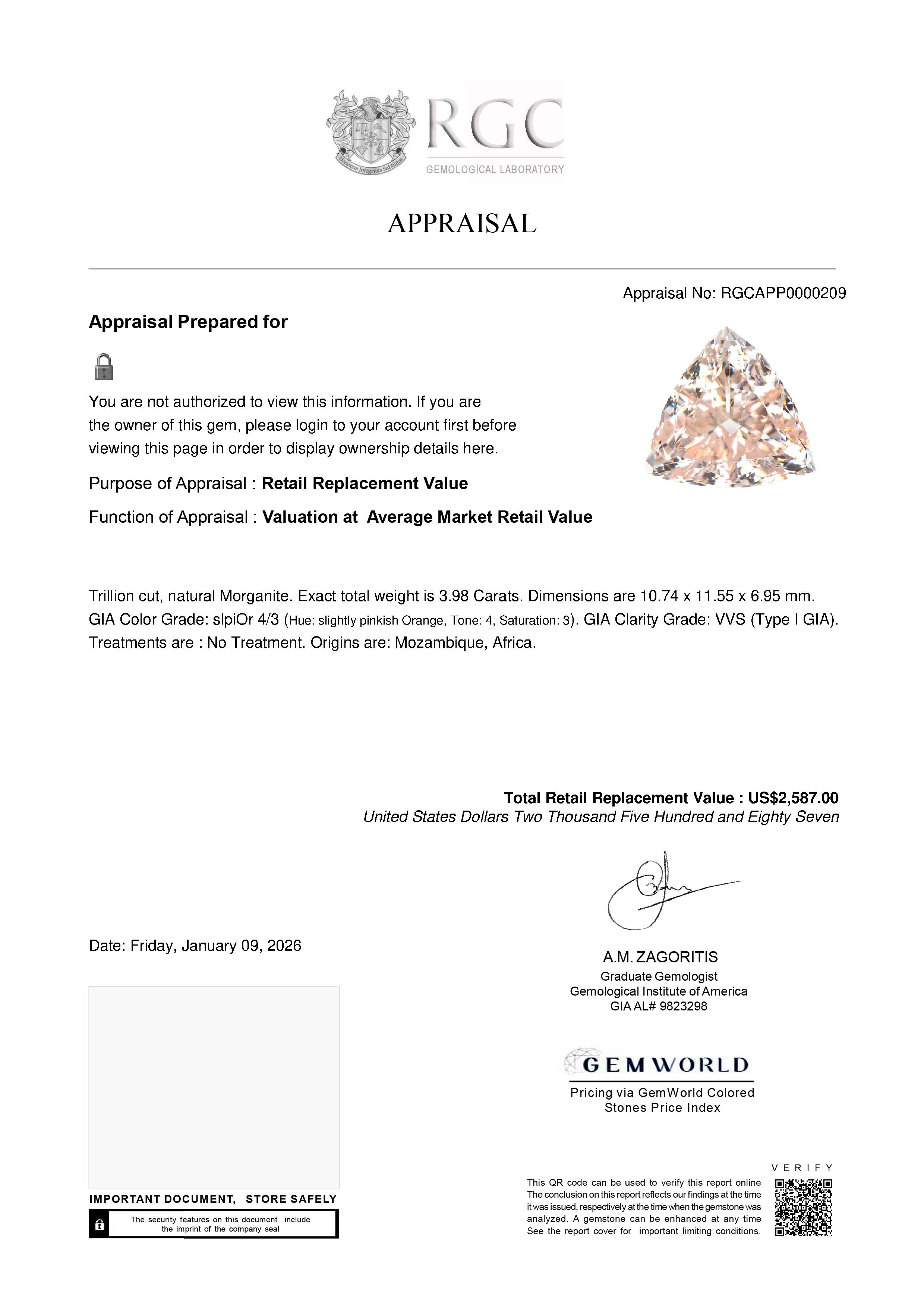 This captivating Trillion Brilliant is colored with alluring peachy tones, enhanced with a stunningly beautiful pink modifier. It dazzles with flawless clarity, making it particularly attention-grabbing when it reflects light. The light return of this morganite is simply superb, producing an impressive sparkle that makes the stone even more attractive. This beautifully cut and carefully polished stone is a testament to extraordinary craftsmanship; it is a gem that easily stands out due to its high-level clarity and enchanting color. Rich in size, hue, and clarity, this Trillion Brilliant Morganite is, indeed, exceptionally beautiful.