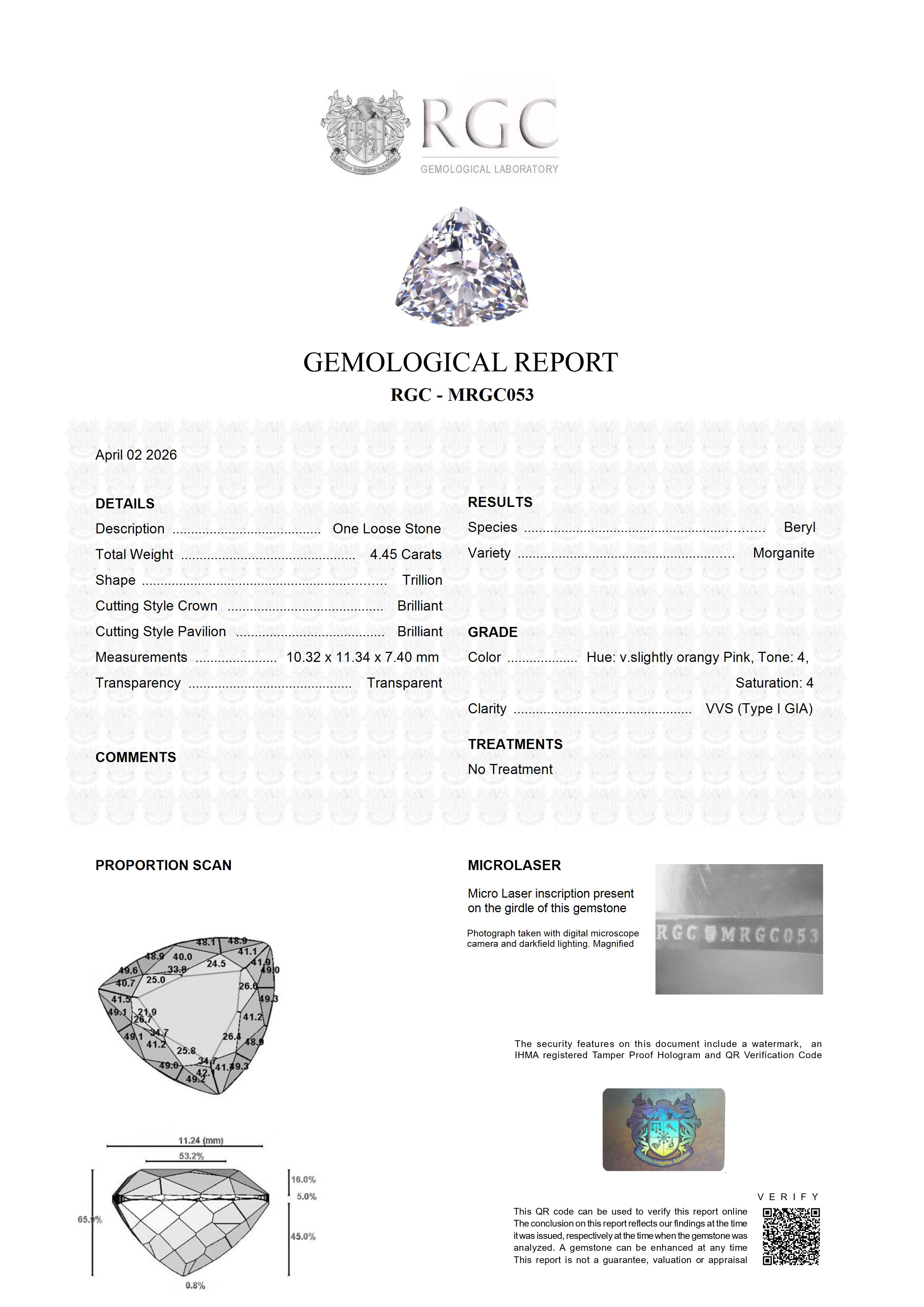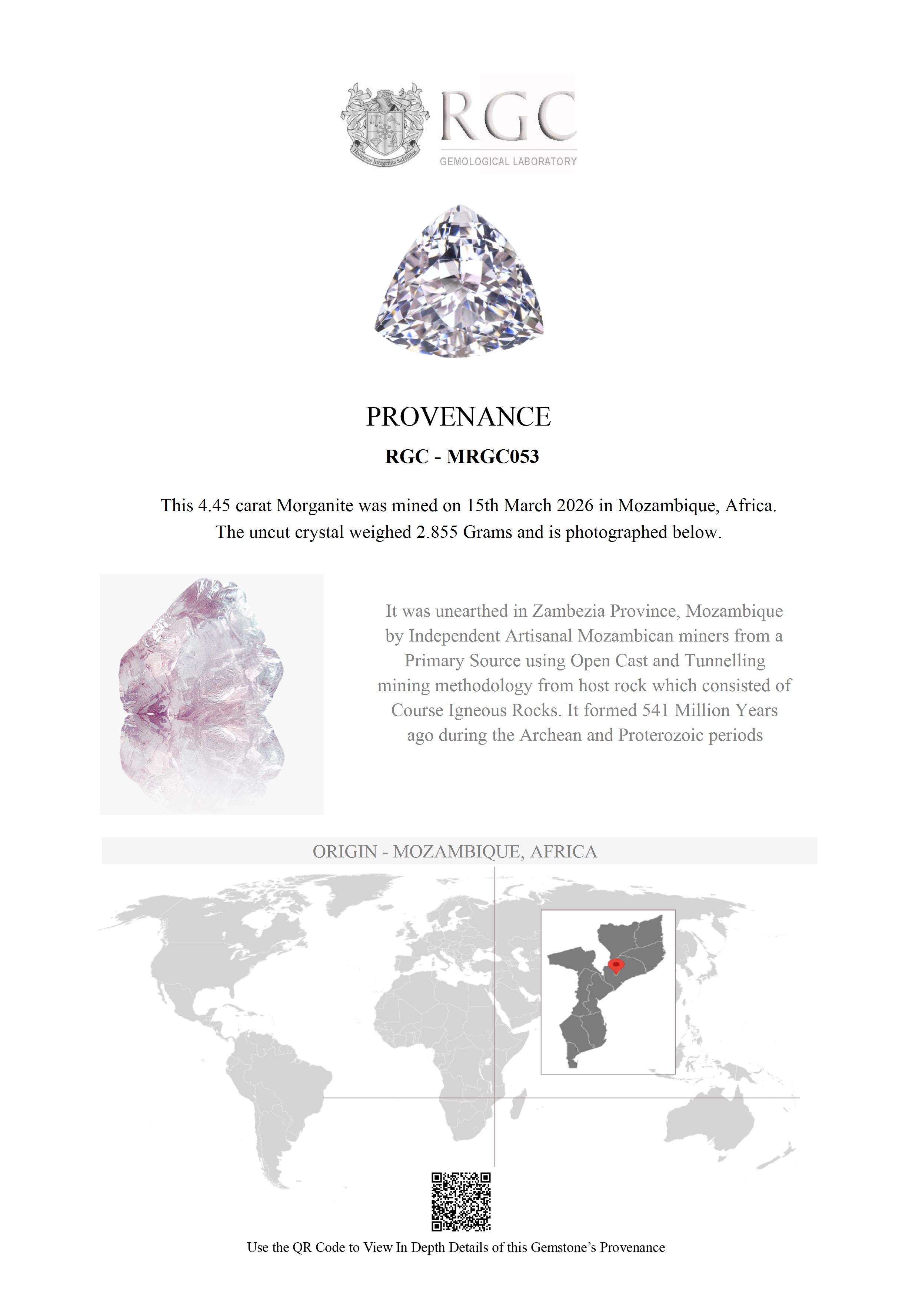 This exceptional morganite, expertly fashioned in a striking trillion brilliant cut, captivates with an explosive display of brilliance and fire. Its top-grade icy pink hue radiates a refined luminosity, balancing delicate color with vivid light performance. The precision of the cut enhances every facet, creating sharp reflections and a dynamic scintillation that brings the gemstone vividly to life. With flawless clarity, the stone offers a pristine and uninterrupted interior, allowing its brilliance to shine with pure intensity. Sourced from superb Mozambique material, this morganite represents the pinnacle of quality and craftsmanship—an elegant, contemporary gemstone that combines rarity, beauty, and a distinctly modern allure.