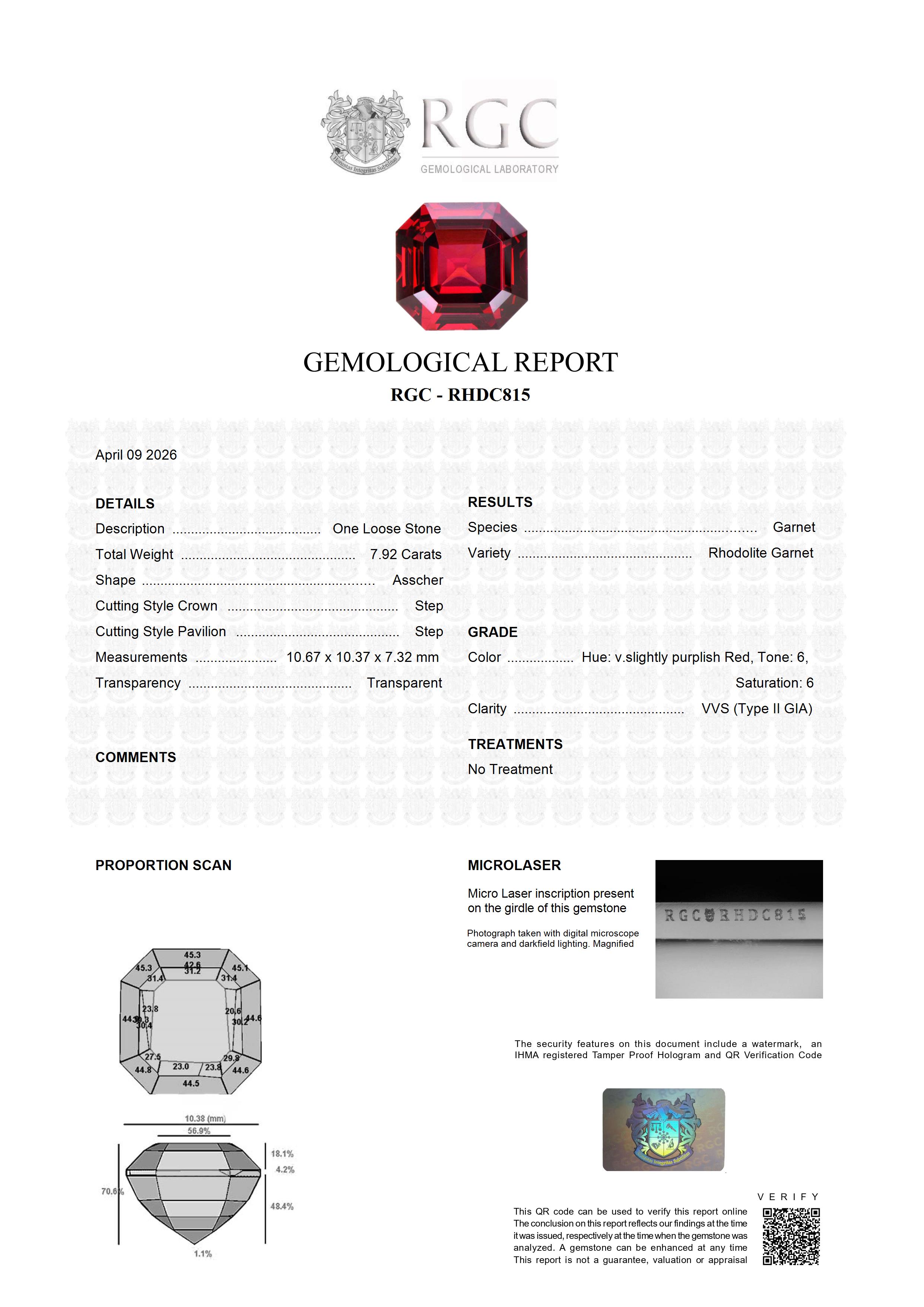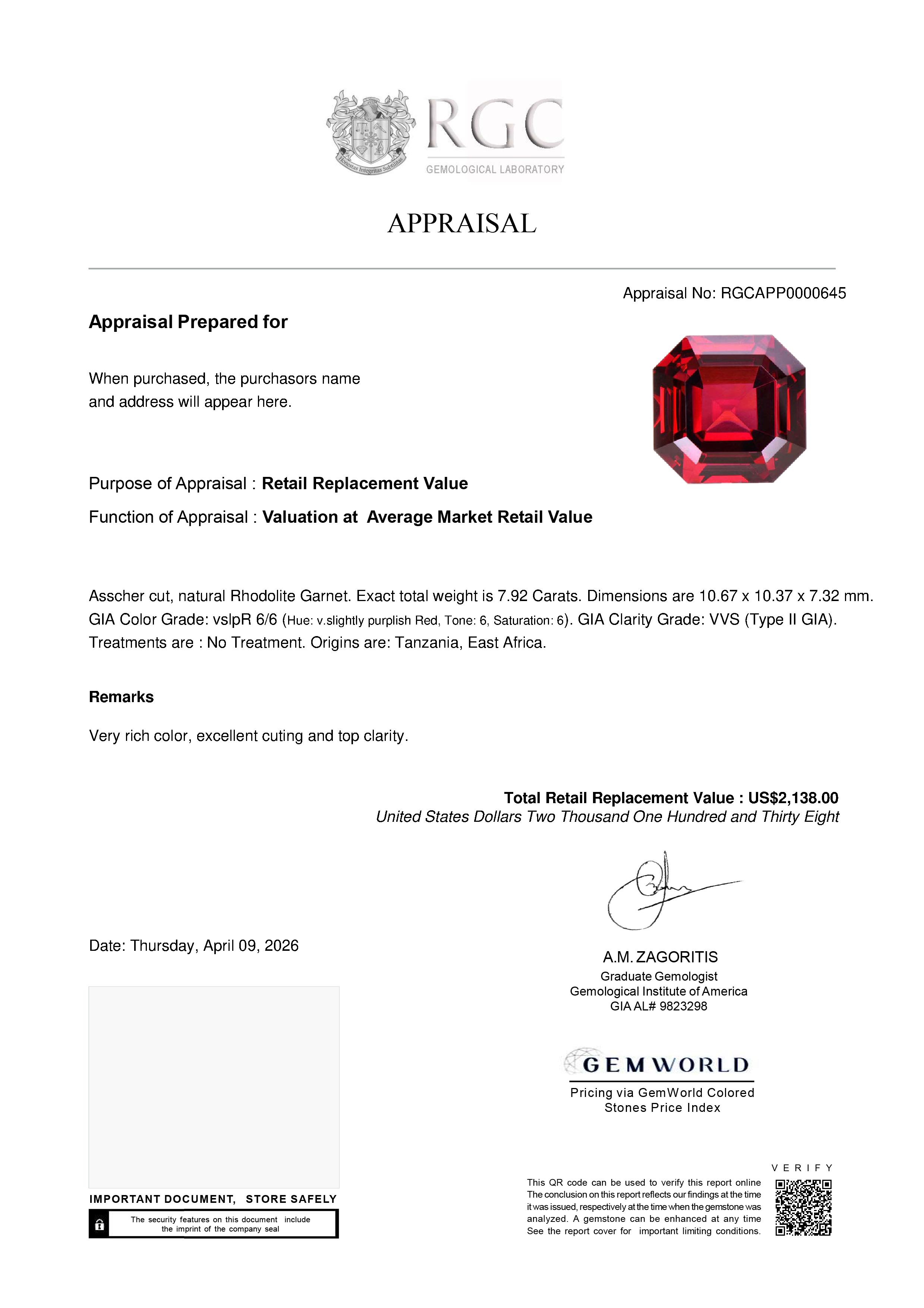 A classic Umba Rhodolite, exhibiting a rich, sumptuous deep red hue with just the slightest hint of purple. A beautifull cut Asscher with flawless clarity. Very beautiful indeed. Would make a superb ring or pendant - why not use our Design Your Own feature to create yourself a piece of jewelry - simple click on the Add to Setting button.
