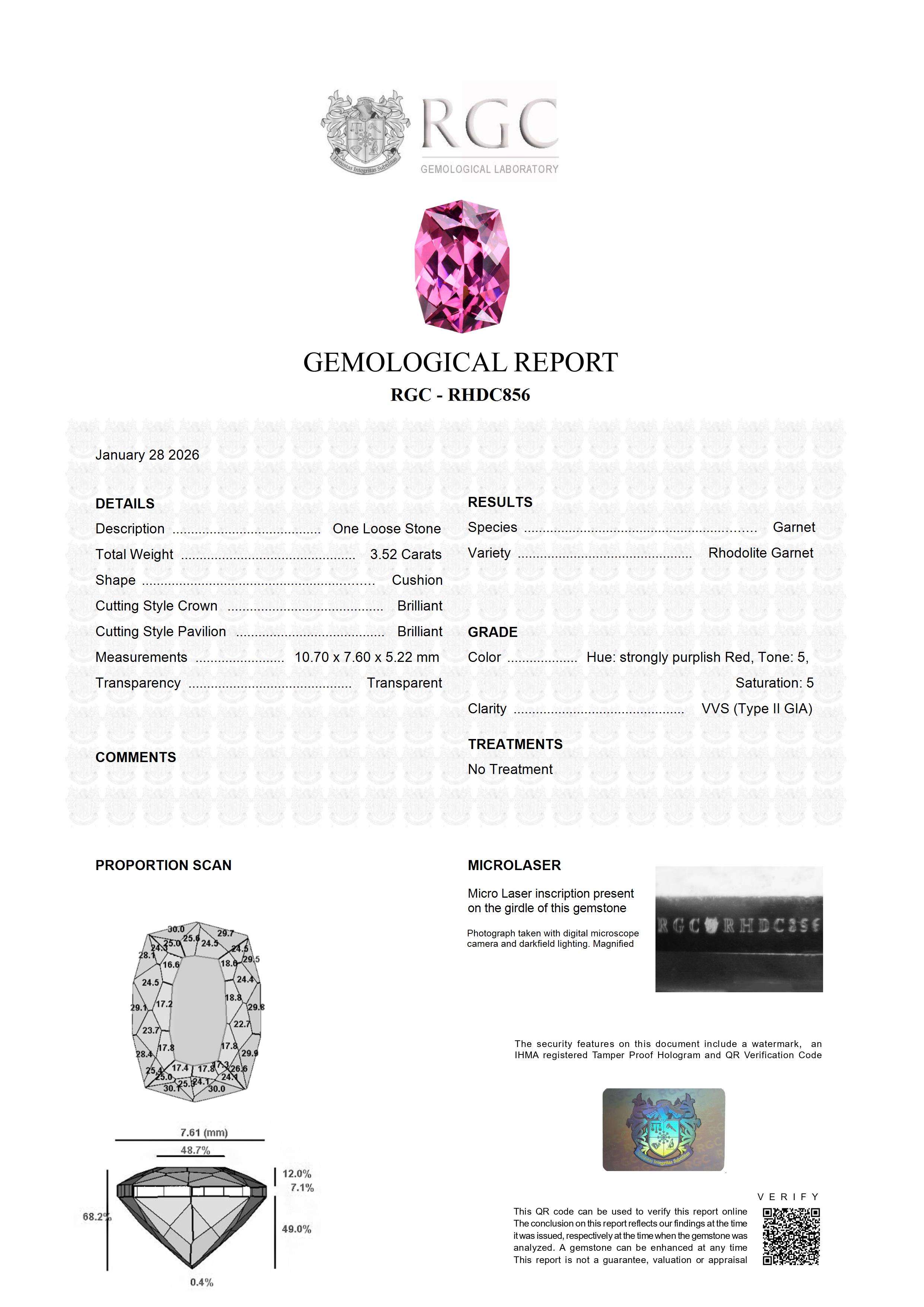 This gemstone has been laser inscribed for security purposes using the latest micro laser technology. The image above is the actual inscription on this gemstone photographed with a specialized micro camera at 45 x. The inscription corresponds with the certificate report number on the accompanying GIA accredited gemologist Gemological Report.