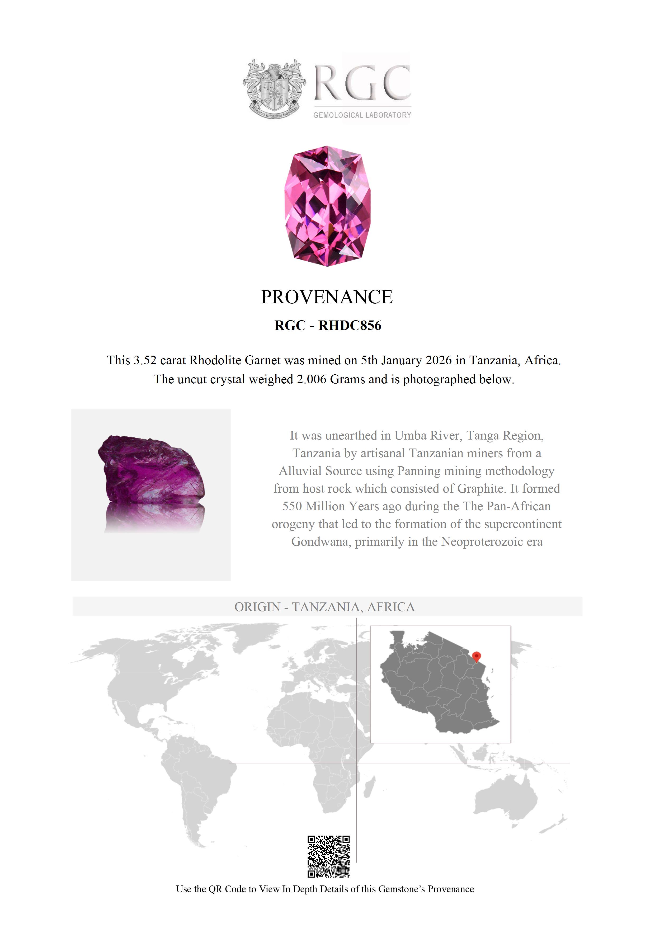 Near the small village of Mnazi, in the Usambara Mountains of Tanzania, a dirt track winds down the valley following the northern tributary of the famous Umba River. From here the road heads southwards and then eastwards to the Gerevi Hills. As the Umba River meanders through these hills it has for centuries deposited a gem gravel on the twists and bends of the river. It is among these deposits that this Rhodolite was found.