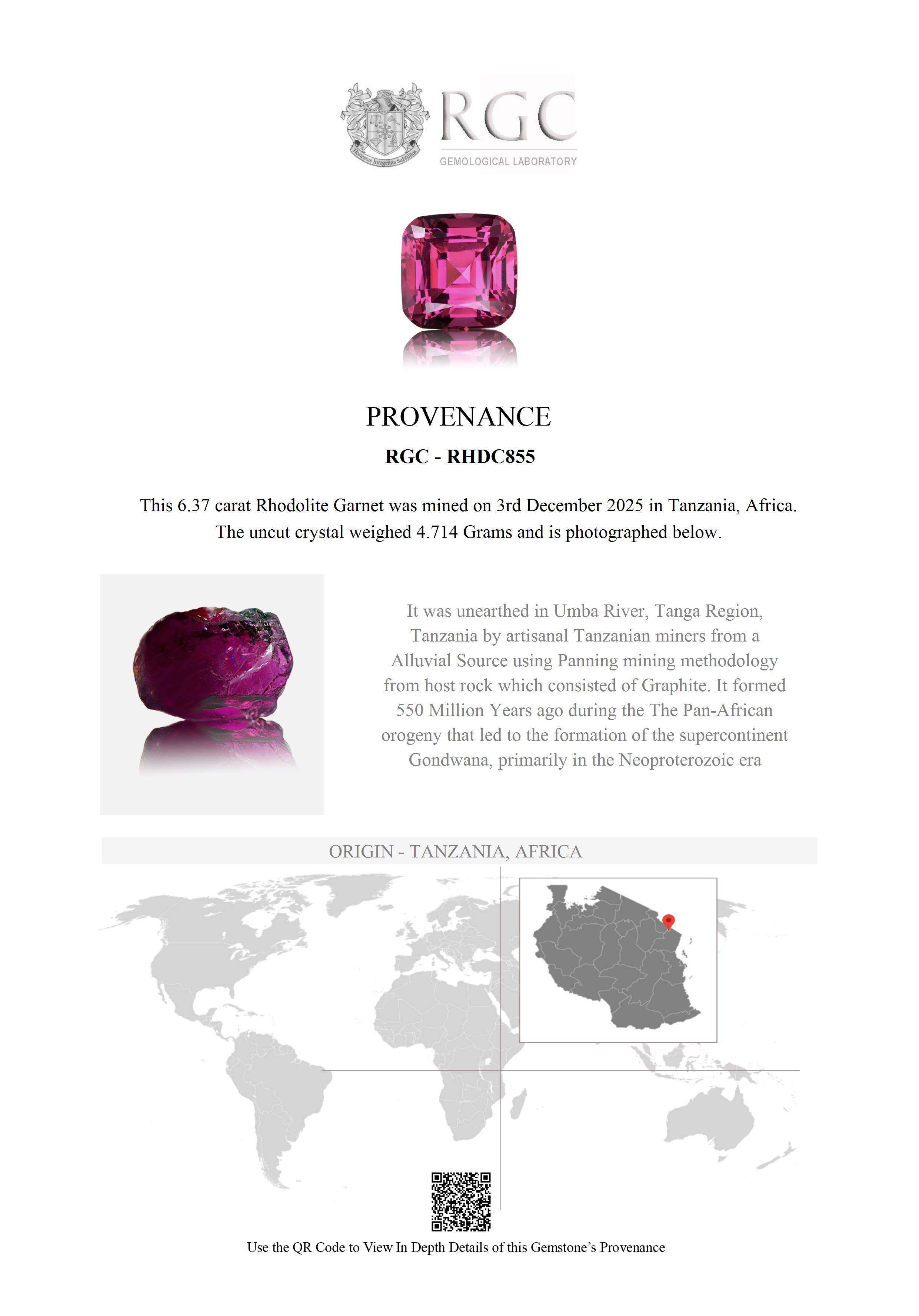 Near the small village of Mnazi, in the Usambara Mountains of Tanzania, a dirt track winds down the valley following the northern tributary of the famous Umba River. From here the road heads southwards and then eastwards to the Gerevi Hills. As the Umba River meanders through these hills it has for centuries deposited a gem gravel on the twists and bends of the river. It is among these deposits that this Rhodolite was found.
