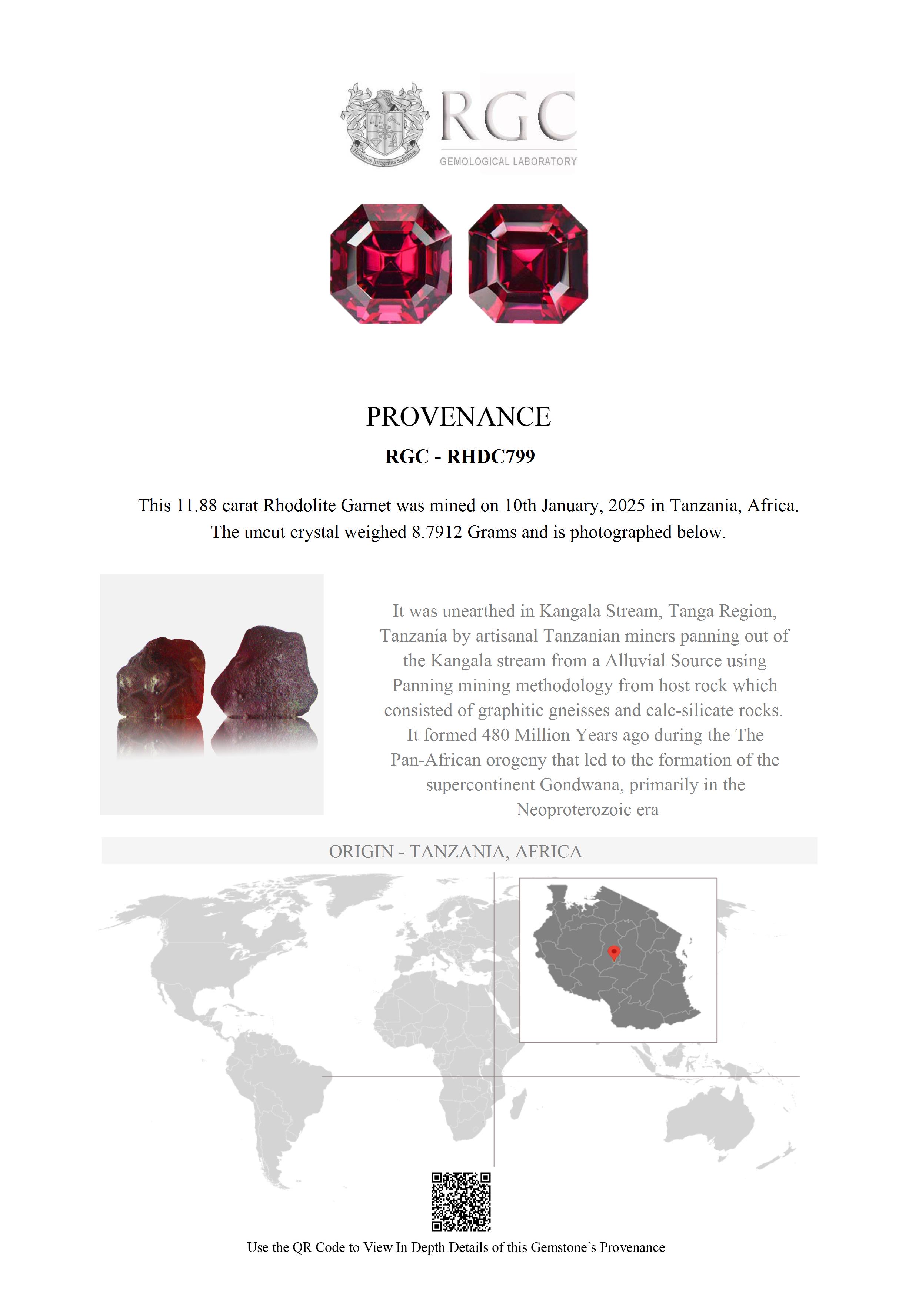 Mined on 10th January, 2025 in Kangala Stream, Tanga Region, Tanzania, AfricaThis Rhodolite Garnet is over 480 Million Years old. After being removed from the vein and "knocked" to remove the host rock, this Rhodolite Garnet weighed 8.7912 Grams. The photograph on the left, shows it as it looked at this stage in its journey. Tests showed it has a Specific Gravity of 3.84, an optic character of SR and it formed in the Othorhombic crystal system. Its Chemical Composition is Manganese Alluminium Silicate and its Cause of Color is Iron