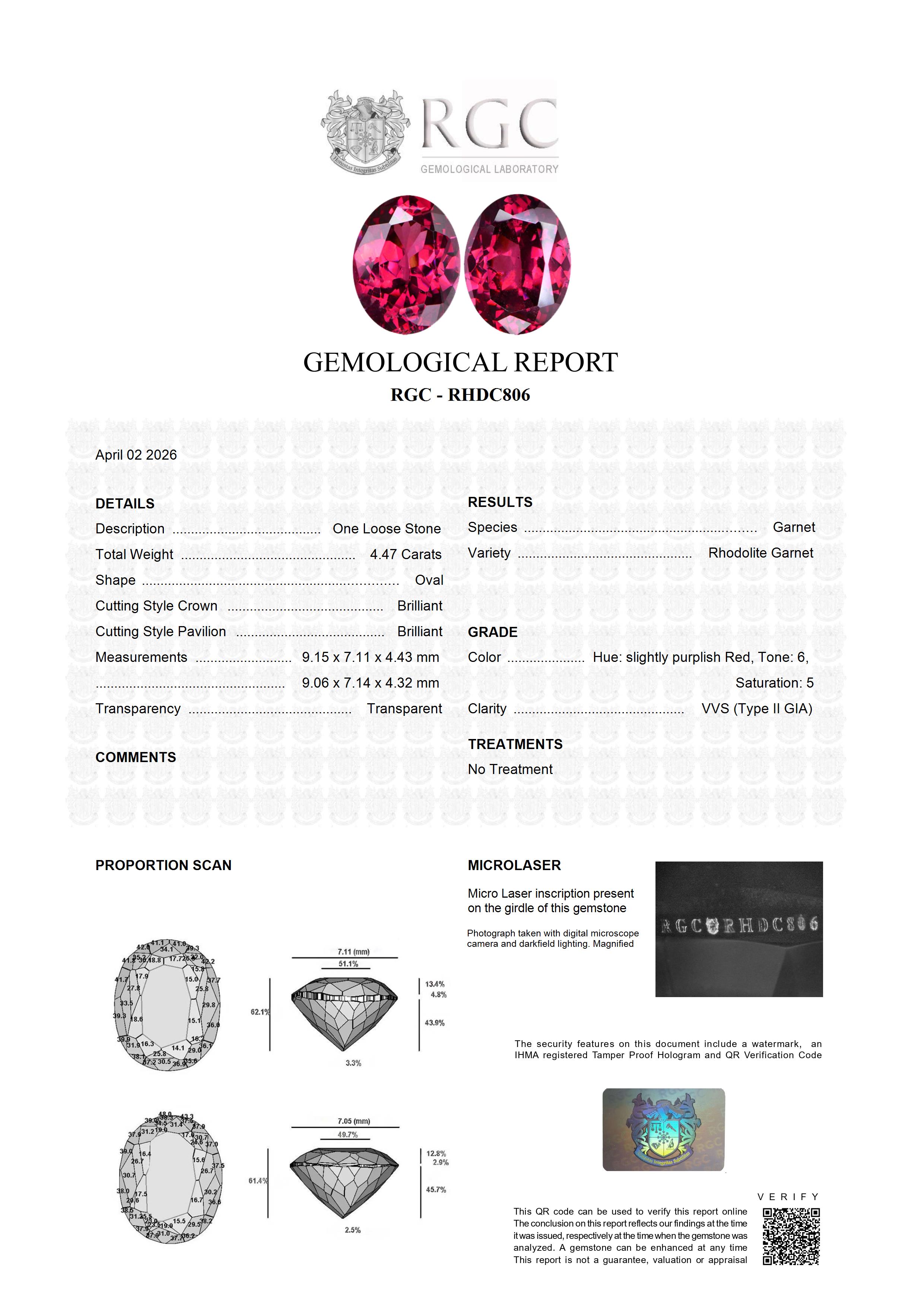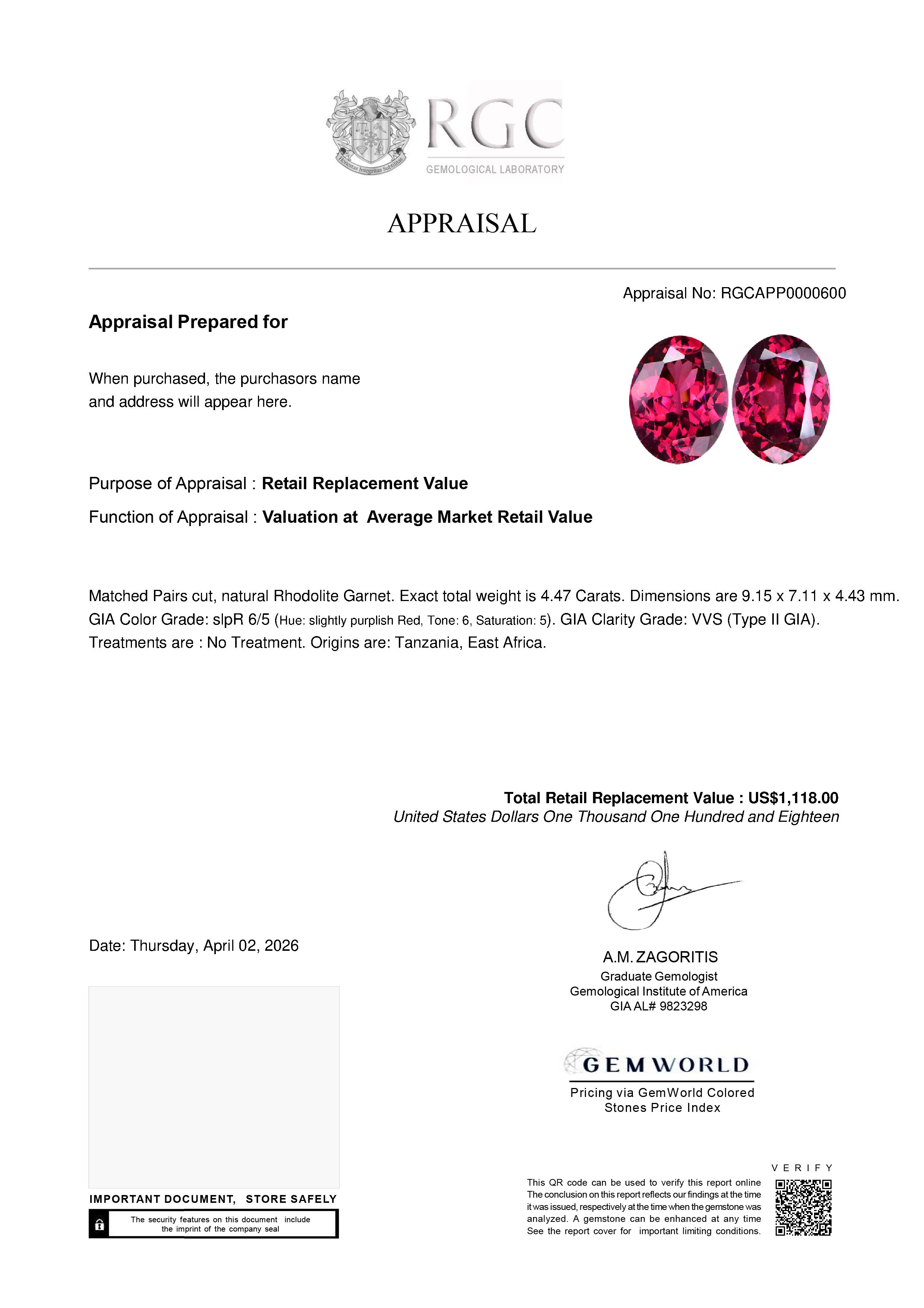 This exquisite matched pair of rhodolite garnet ovals, totaling 4.47 carats, offers a harmonious blend of richness and elegance. Displaying a sumptuous, almost velvety red with delicate hints of purple, the color is both deep and captivating. Originating from the renowned Umba Valley in Tanzania, these gemstones are prized for their exceptional saturation and character. Each stone glows with a vivid inner intensity. Perfectly matched in size, shape, and tone, they are ideally suited for a refined pair of earrings, embodying sophistication, rarity, and timeless allure in every facet.`
