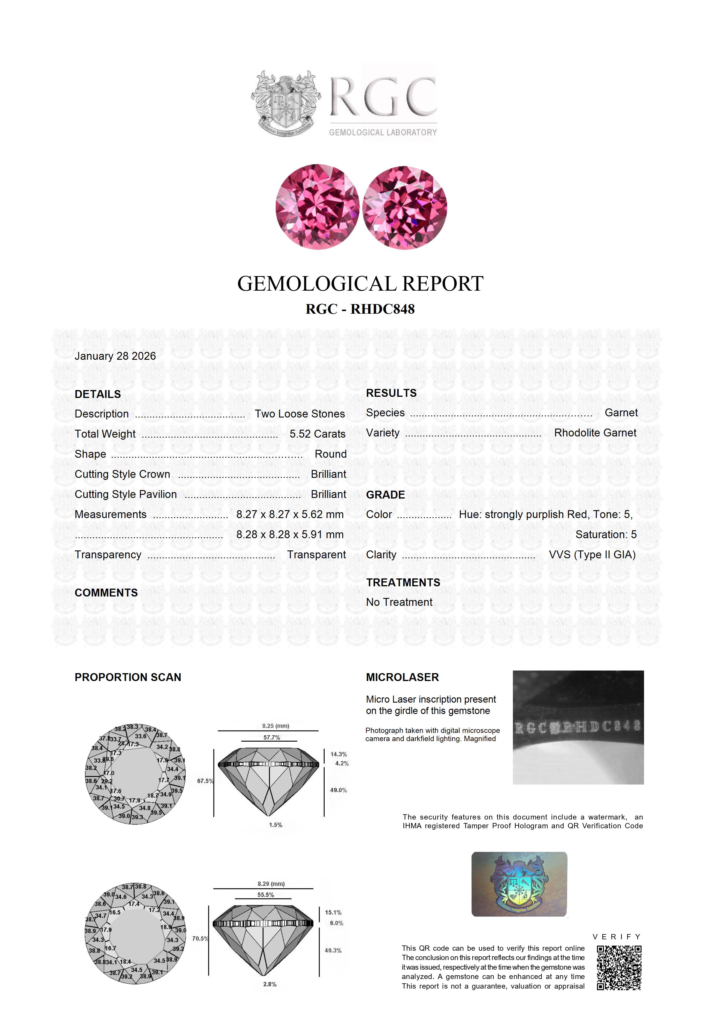 This exquisite matched pair of Round Brilliant Rhodolite Garnets, weighing a total weight of 5.52 carats, captivates the eye, exploding with brilliance and vitality. They exhibit incredible open purple-red hues, a top-grade coloration that is deeply coveted by gem enthusiasts. Recently unearthed in Tanzania's famed Umba Valley, an area renowned for its superior gem gravels, these stones are a testament to the region's wealth of beauty. Their excellent cutting leads to high brilliance.