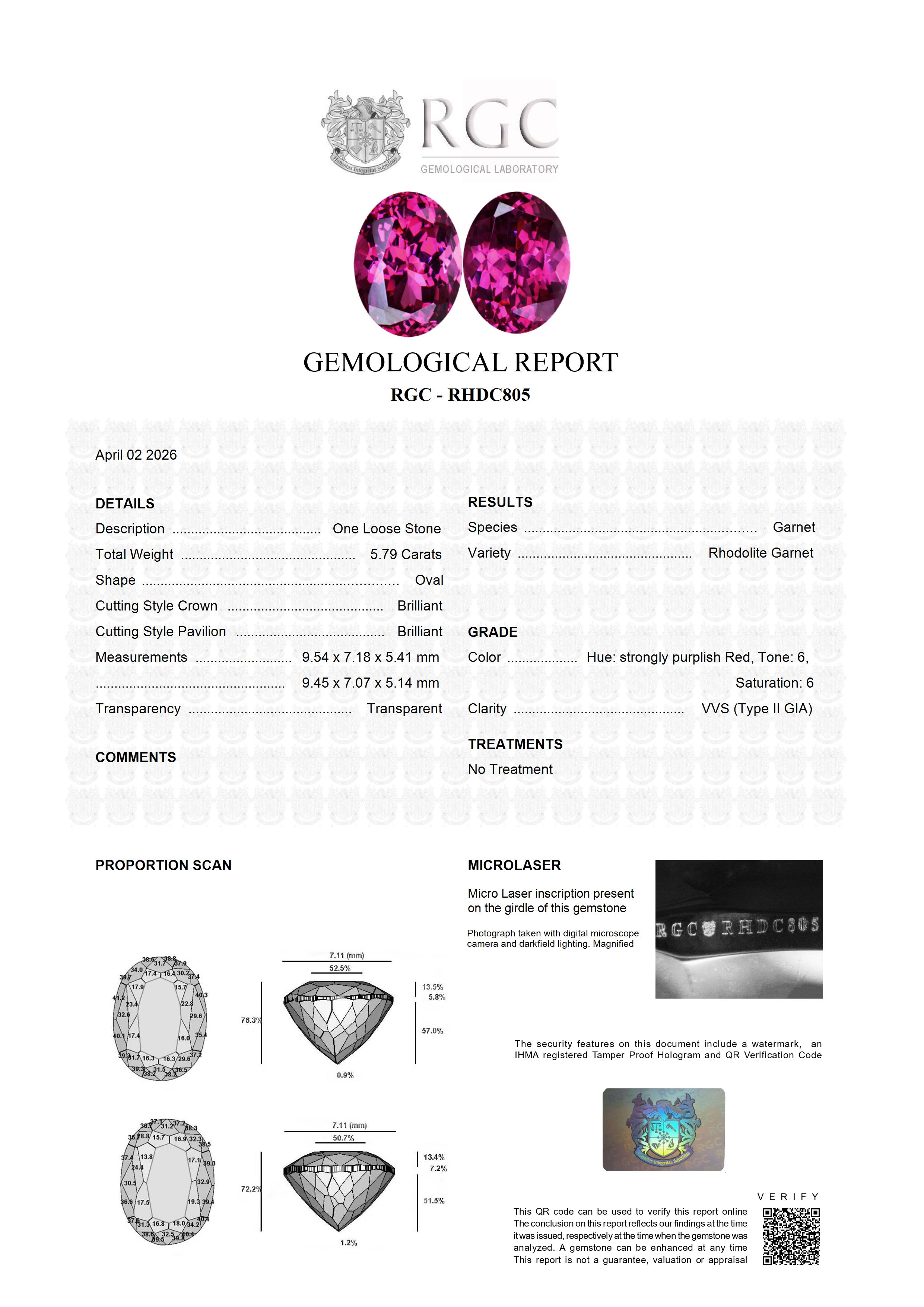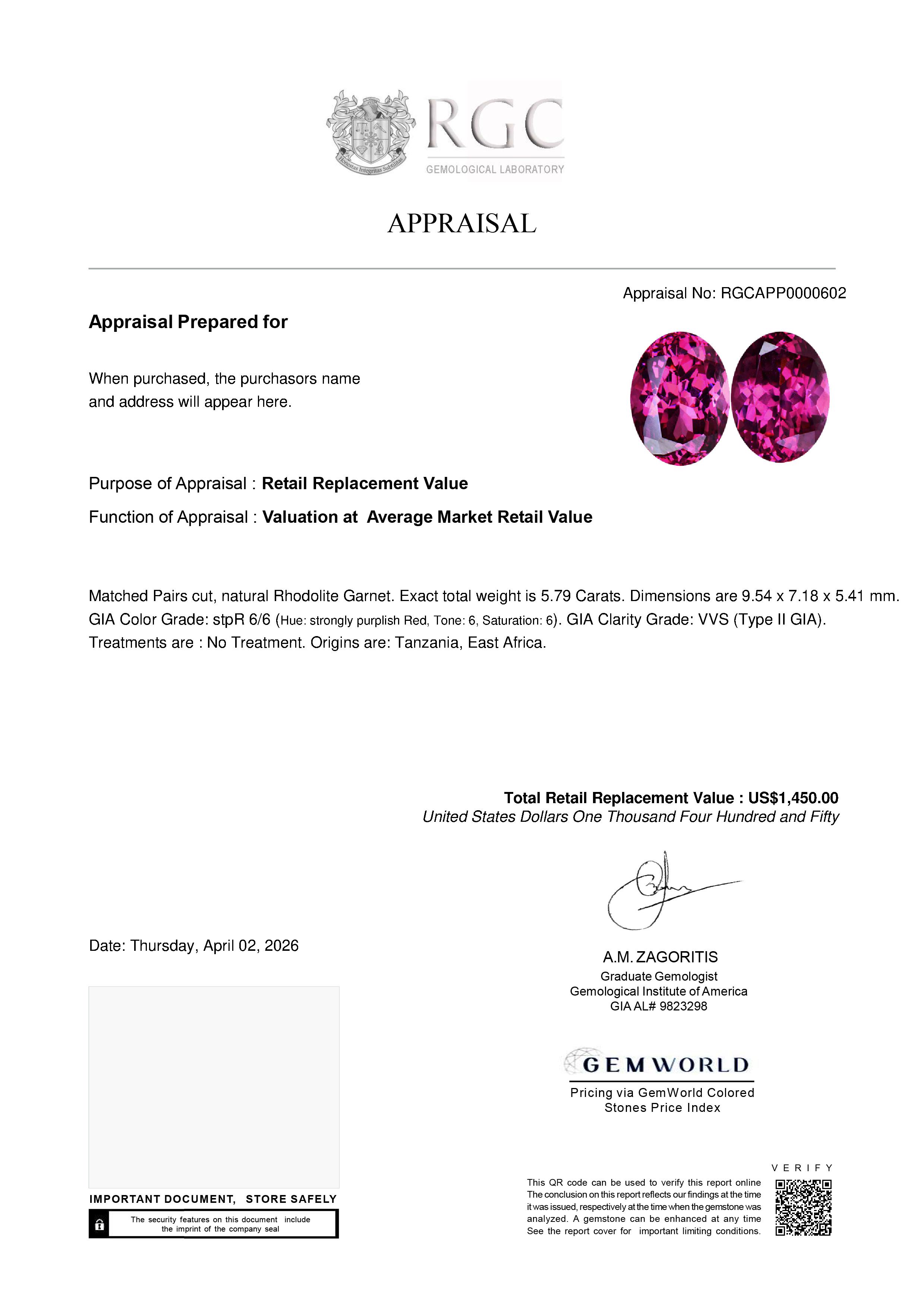 This exceptional matched pair of rhodolite garnet ovals, totaling 5.79 carats, exemplifies the finest qualities of classic Tanga material from Tanzania. Their luscious color—a superb pinkish red with vibrant saturation—captures the hallmark beauty for which this locality is celebrated. Rich and vivid, the stones display a lively brilliance, with expertly cut facets that release an abundance of sparkle with every movement. Both gems boast flawless clarity, offering a pristine, uninterrupted view into their radiant interiors. Perfectly matched in size, shape, and tone, this pair is ideally suited for elegant earrings, combining rarity, precision, and timeless sophistication in a truly captivating presentation.