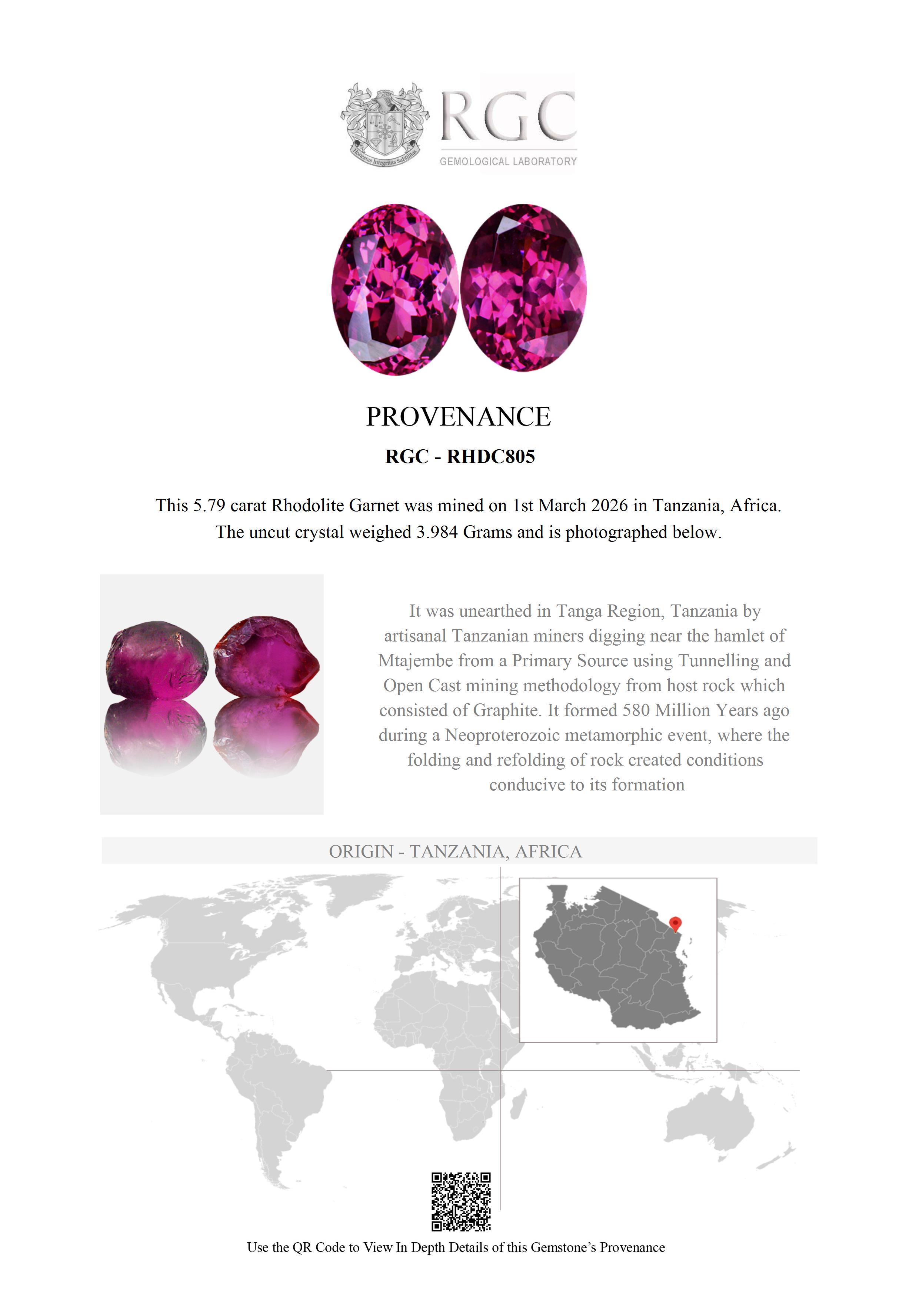 This superb PAIR OF Tanga Rhodolites originated from this deposit, and although mined only recently, they formed hundreds of millions of years ago with a process called metamorphism, where magma pushed its way up through the existing rock. As the magma made contact with the older rock, the intense heat and pressure catalyzed a transformation in the surrounding minerals which recrystallized into minerals stable at the higher temperature. In this case, Rhodolite.